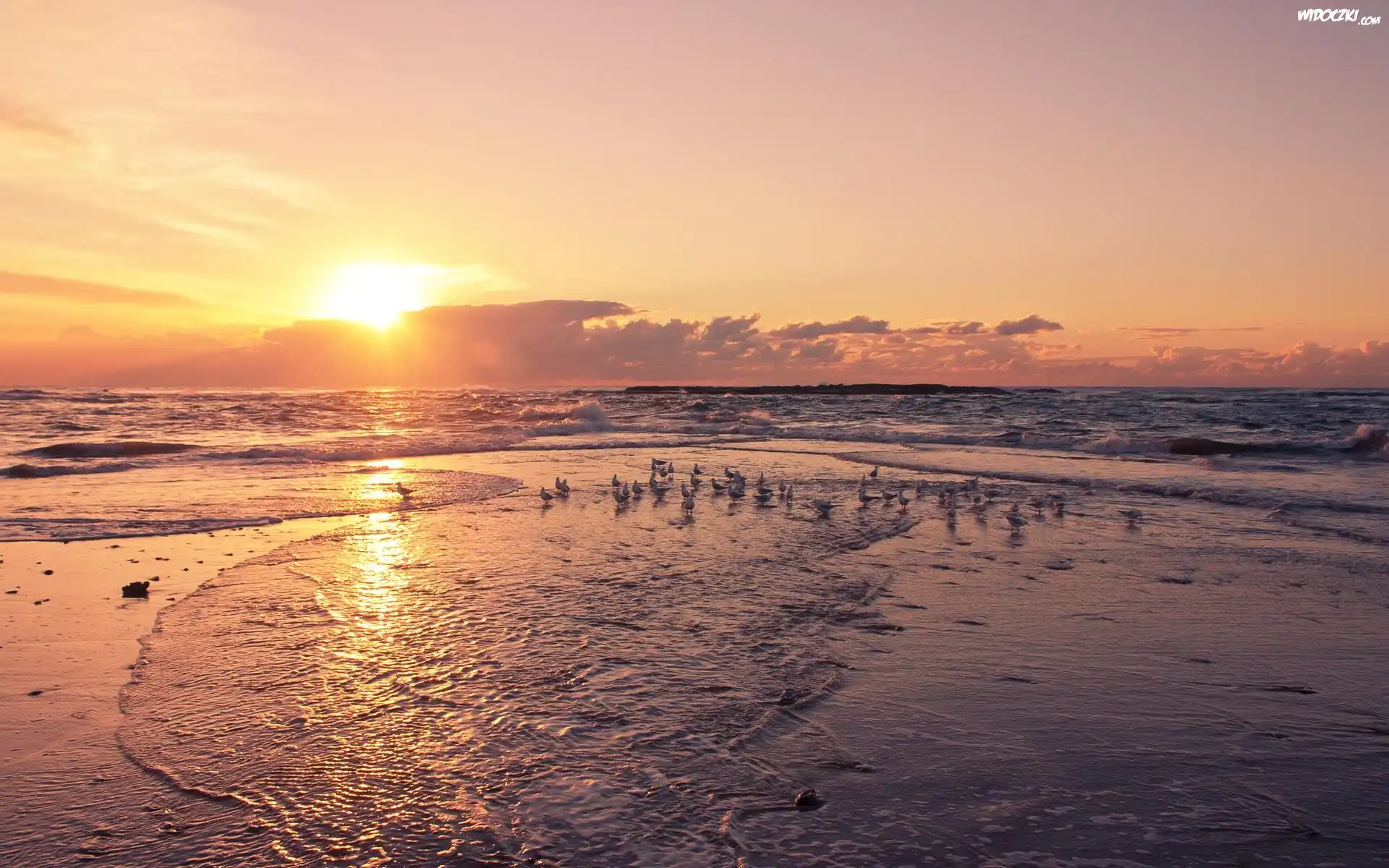 Zdjęcia, Zachód Słońca, Morze, Plaża, Mewy, Ptaki