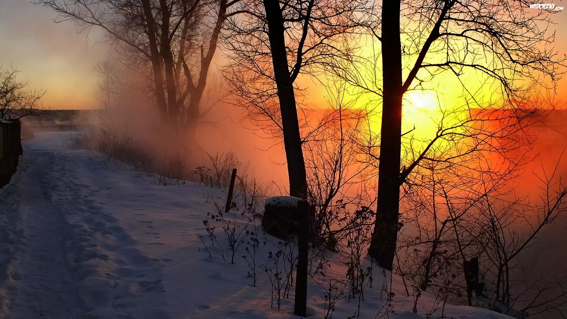Zachód, Słońca, Dróżka, Drzewa, Mgła, Zima