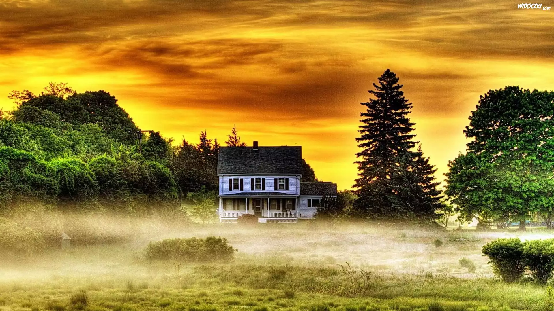 Zdjęcia, Zachód, Słońca, Drzewa, Mgła, Dom