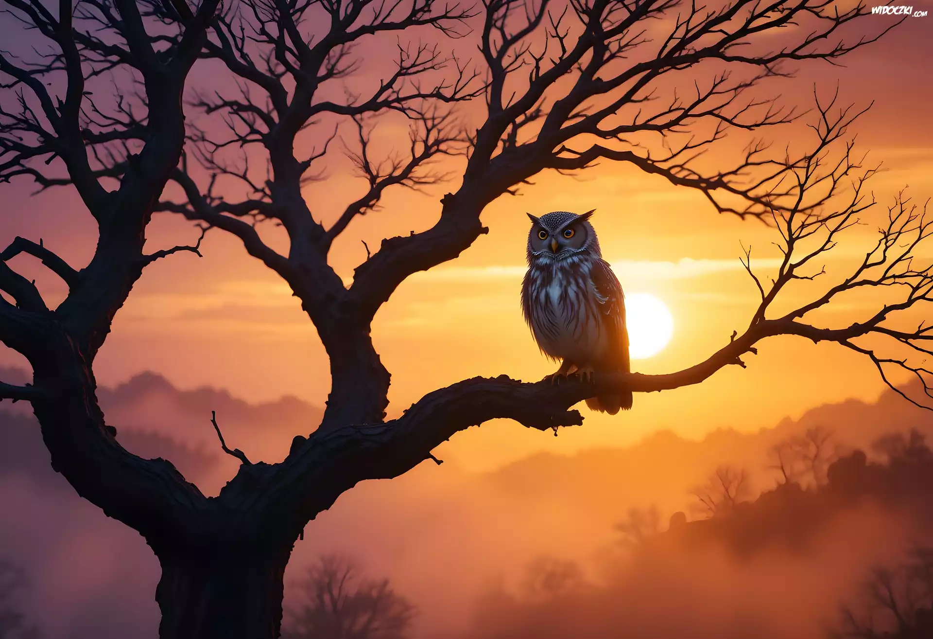 Sowa, Puchacz, Drzewo, Zachód słońca, Mgła