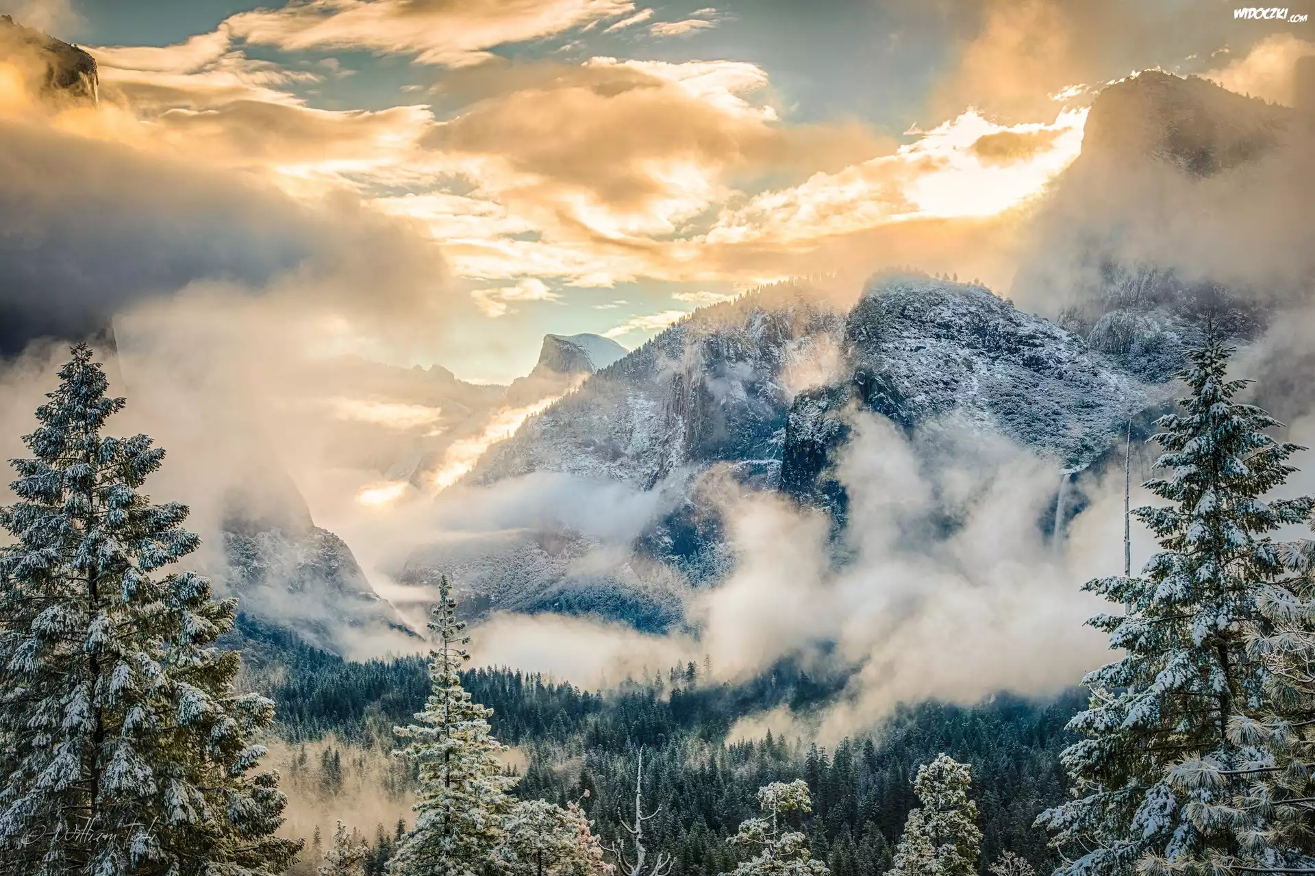 Zdjęcia, Zachód, Słońca, Góry, Las, Mgła, Zima