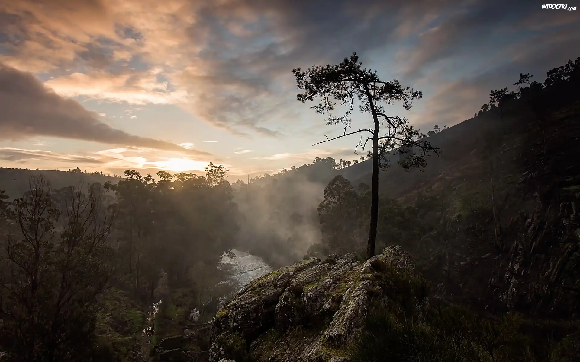Zachód Słońca, Skały, Drzewa, Mgła, Zmierzch