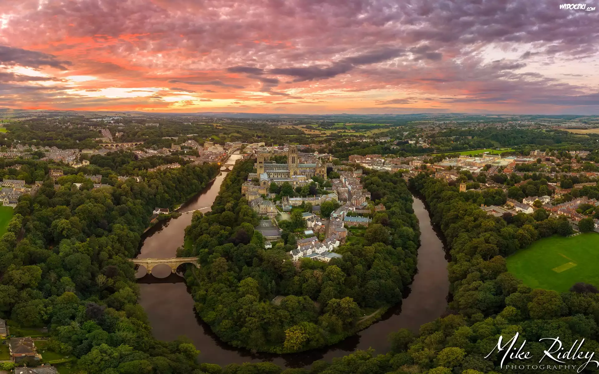 Zdjęcia, Anglia, Durham, Miasto, Domy, Rzeka, Katedra, Durham Cathedral, Drzewa, Zachód słońca, Chmury