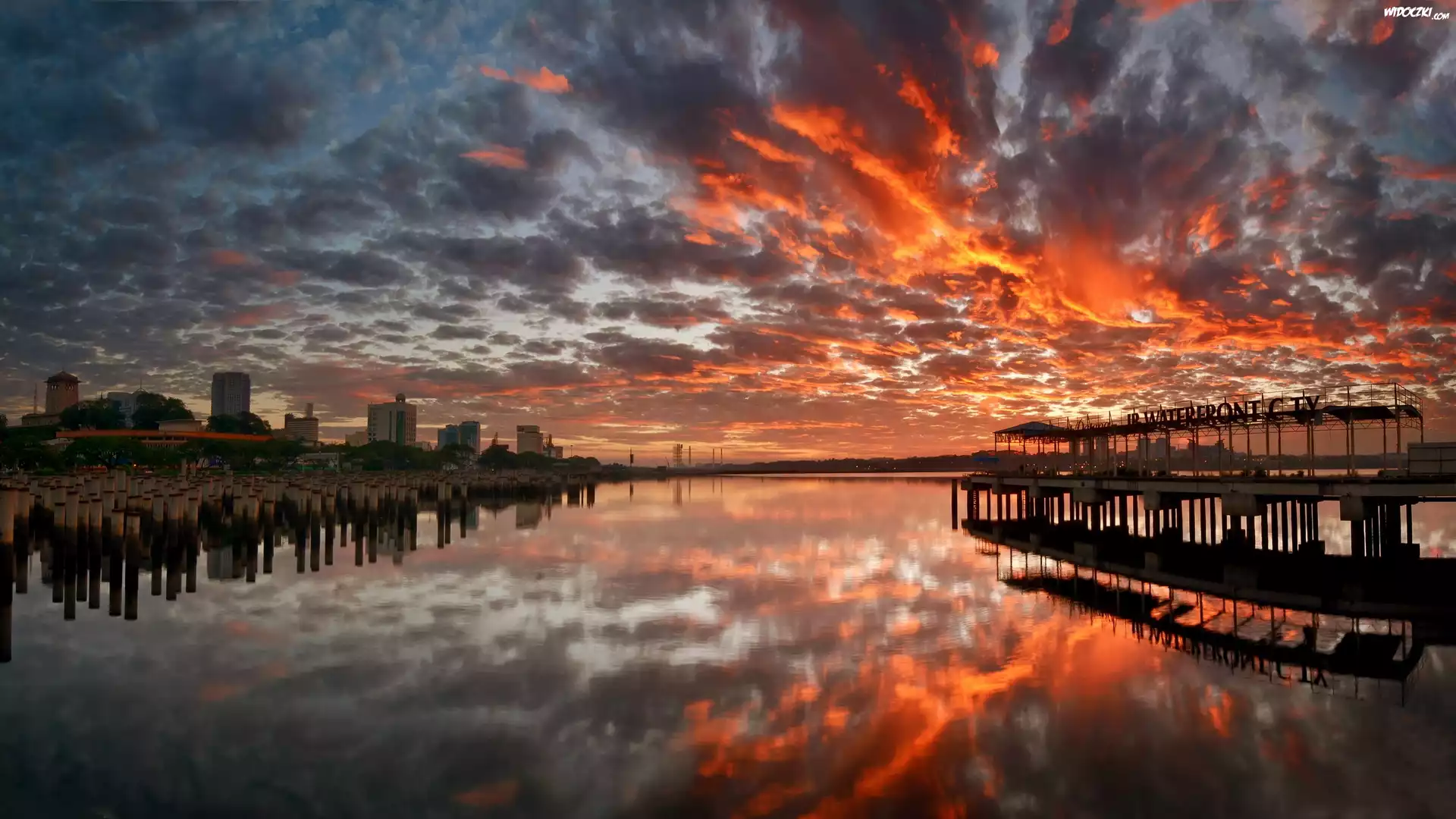 Zachód, Słońca, Jezioro, Domy, Miasto, Nocą