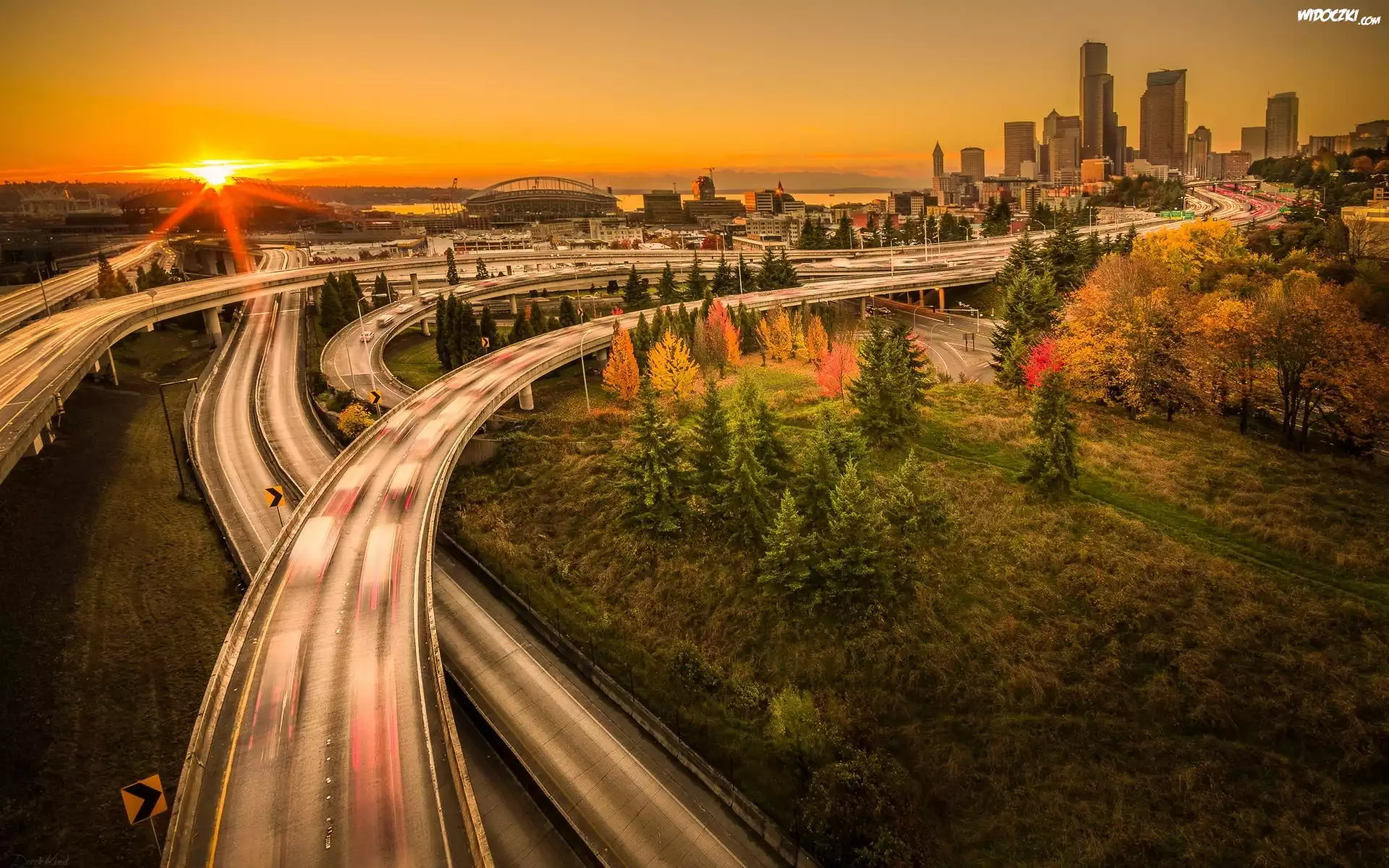 Zdjęcia, Zachód, Słońca, Mosty, Miasto, Drzewa