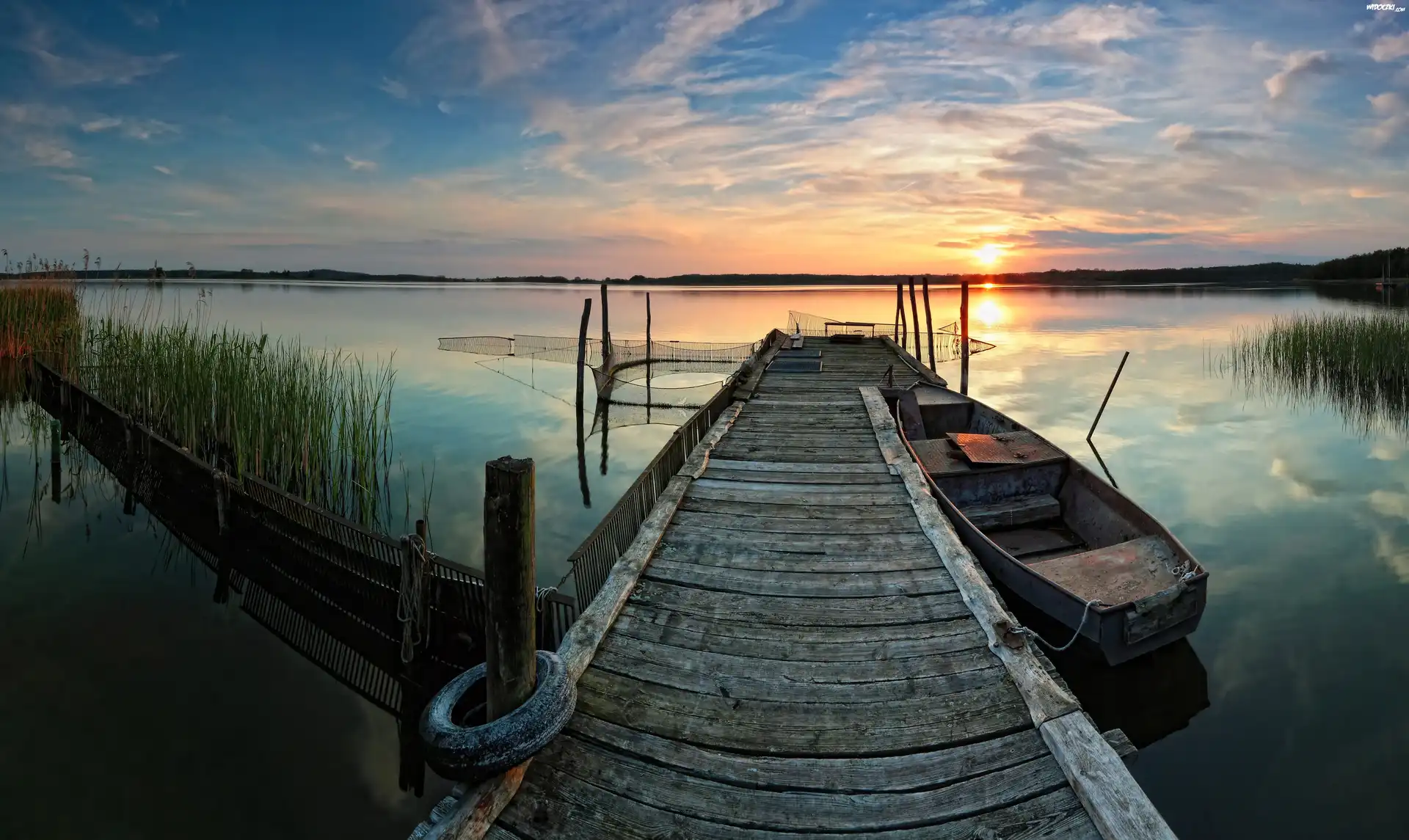 Zdjęcia, Zachód, Słońca, Jezioro, Łódka, Pomost
