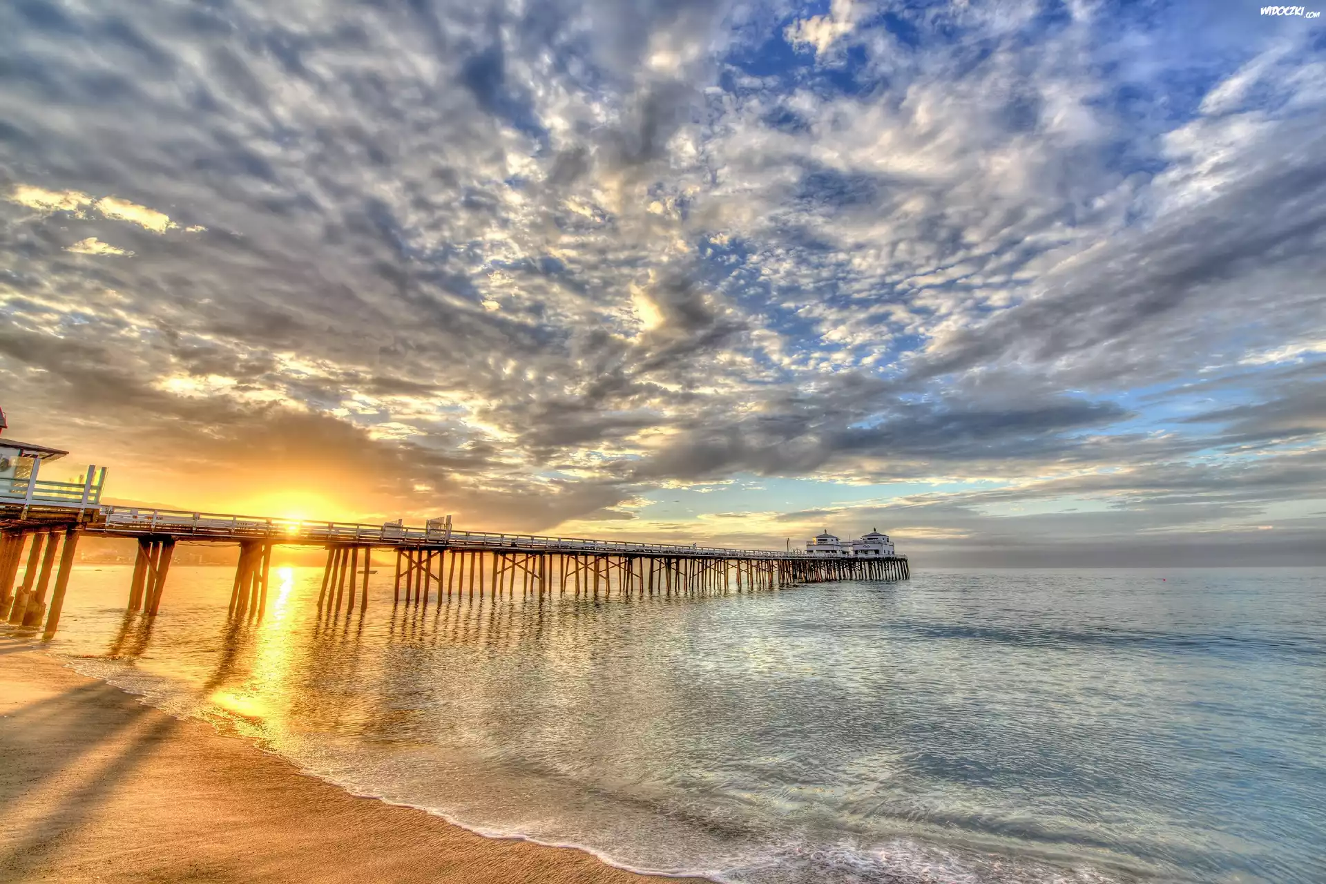 Zdjęcia, Zachód, Słońca, Morze, Molo, Chmury