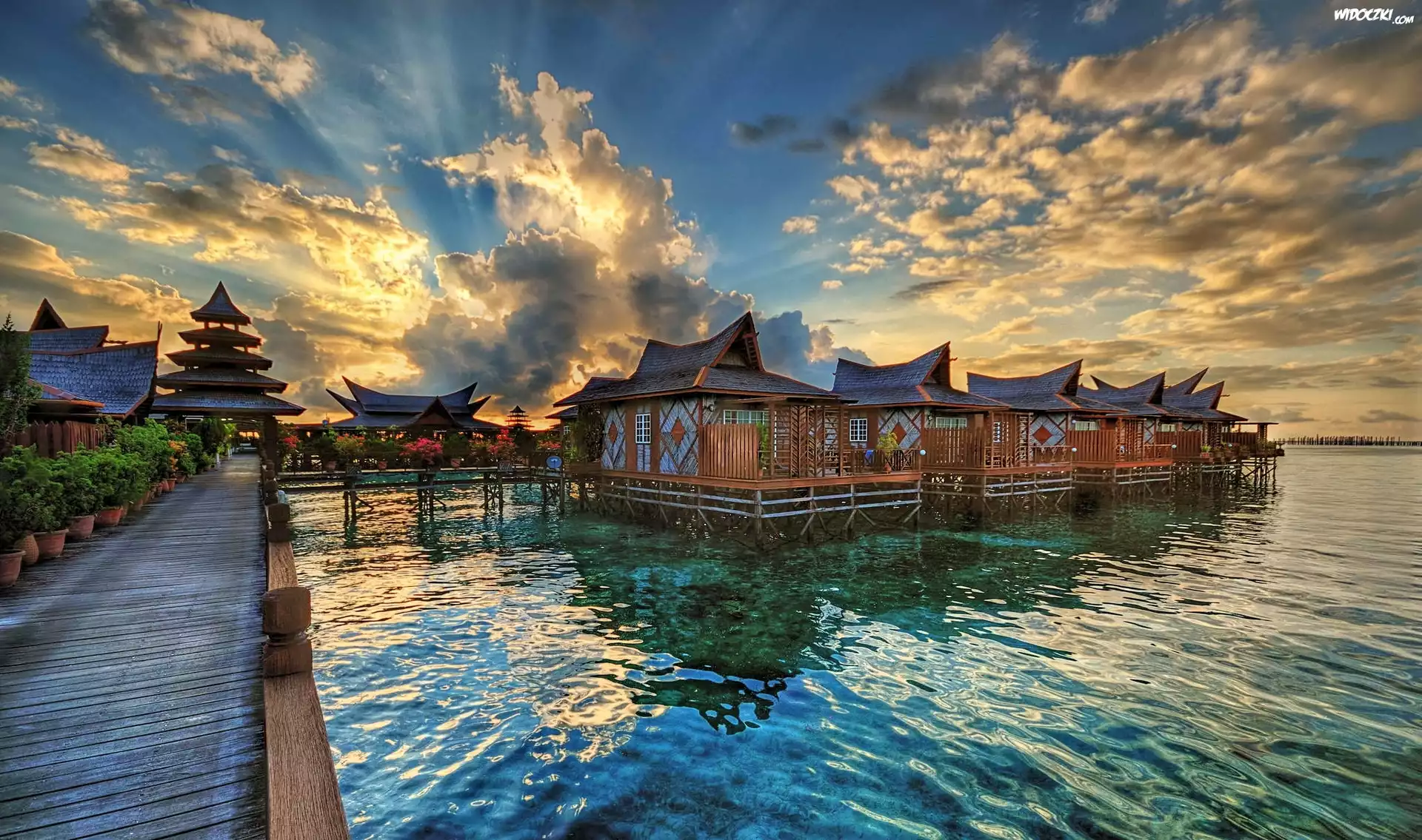 Zdjęcia, Zachód słońca, Morze, Molo, Domki