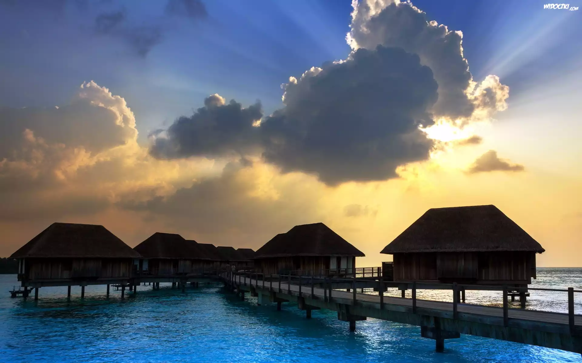 Zdjęcia, Zachód, Słońca, Morze, Molo, Domki