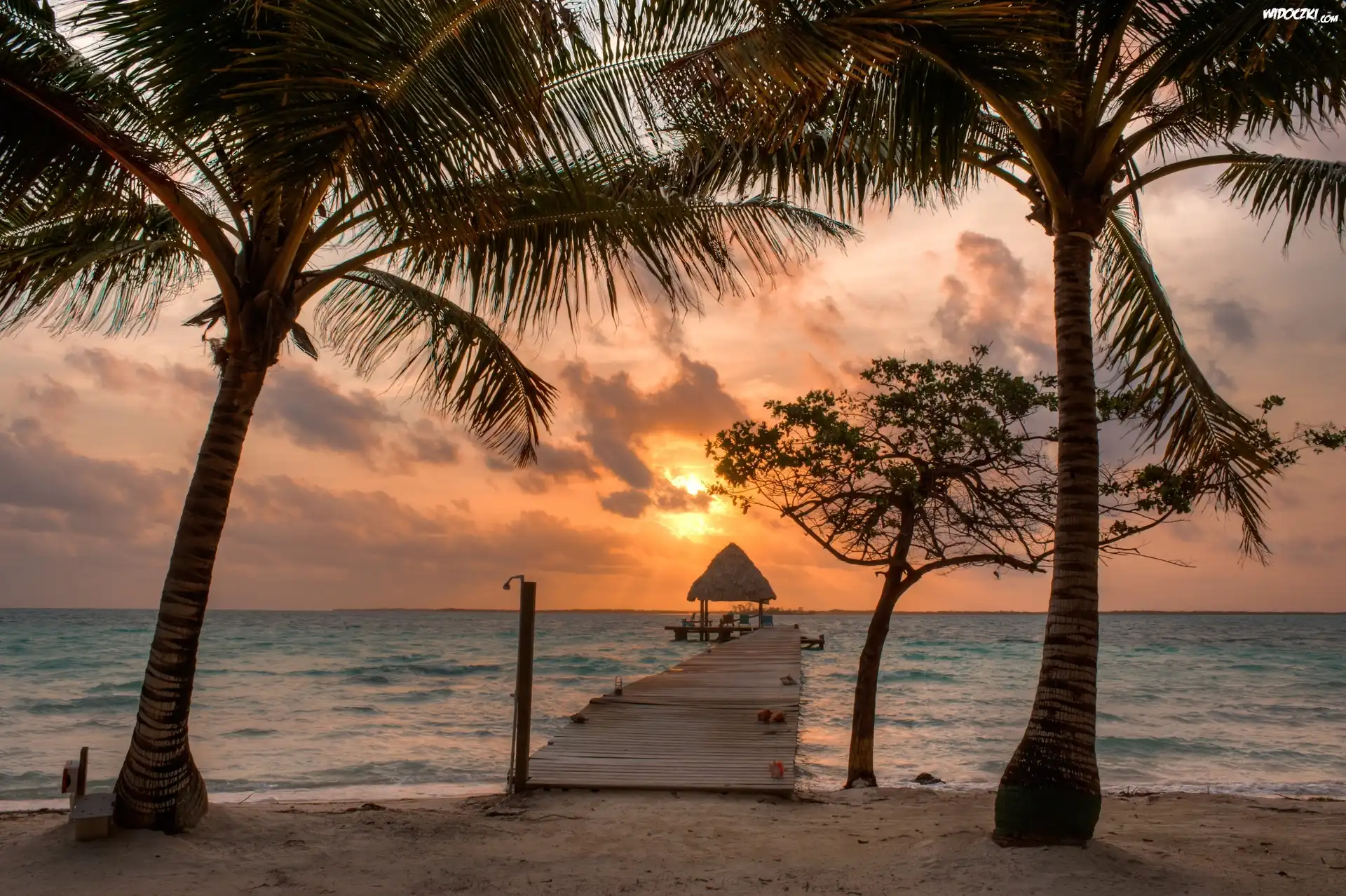 Zdjęcia, Zachód słońca, Morze, Molo, Palmy