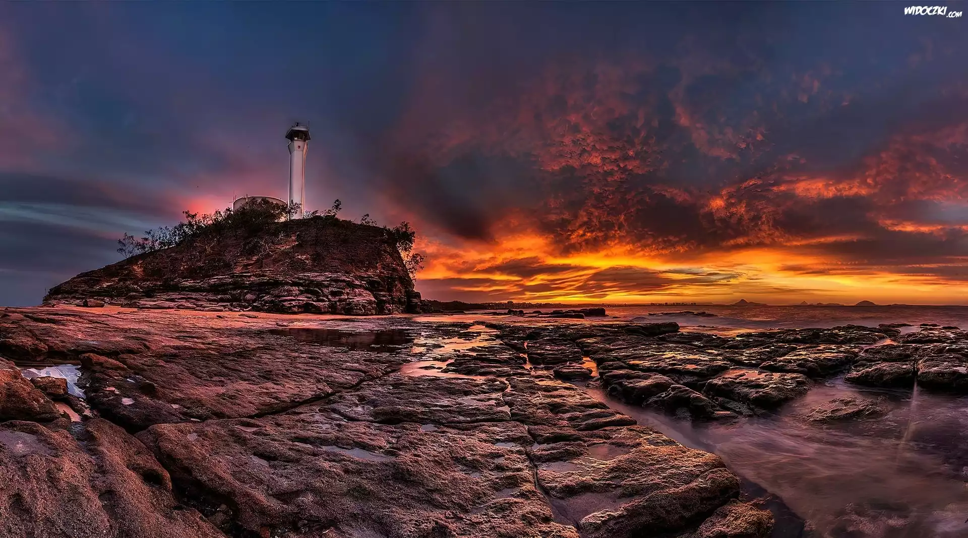 Zdjęcia, Zachód, Słońca, Latarnia, Morska, Skały