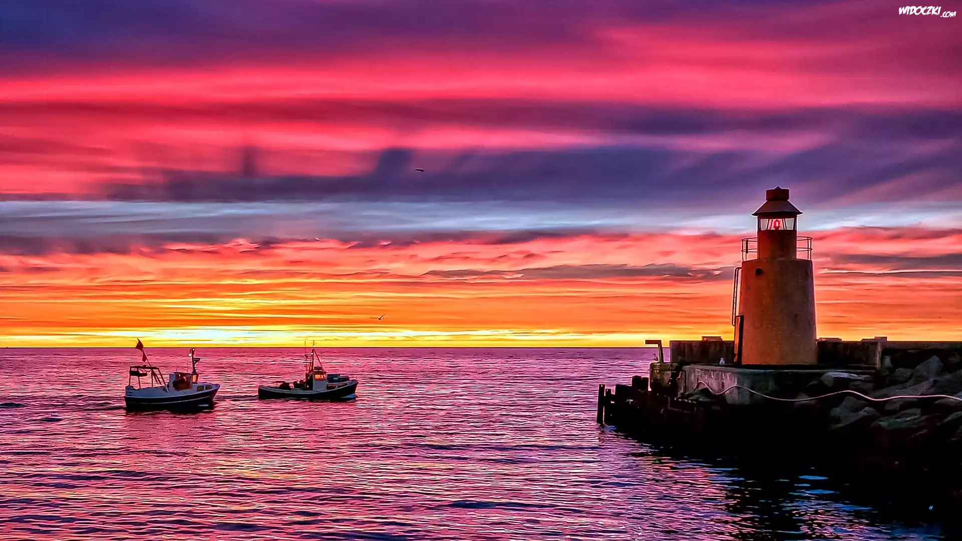 Zdjęcia, Zachód Słońca, Morze, Latarnia, Morska, Kutry