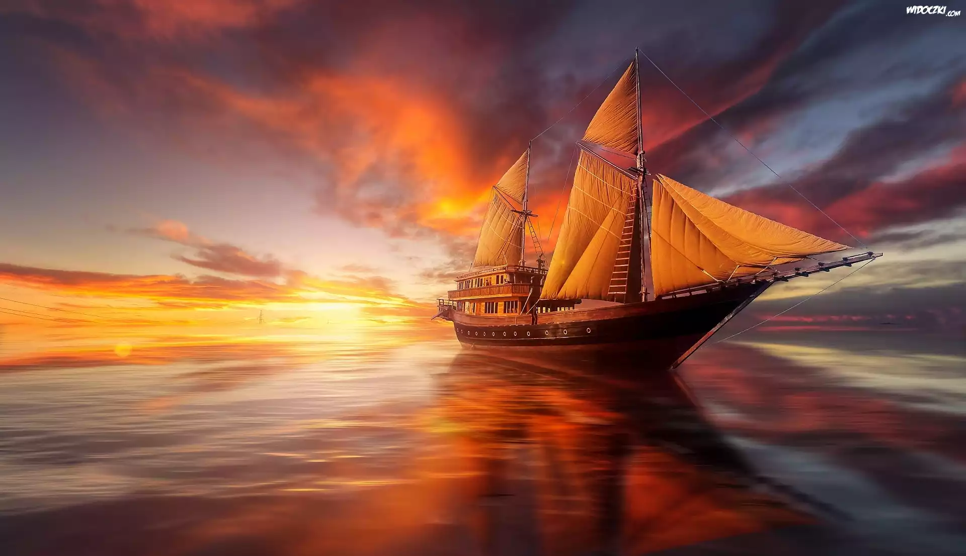 Zdjęcia, Żaglowiec, Morze, Zachód słońca