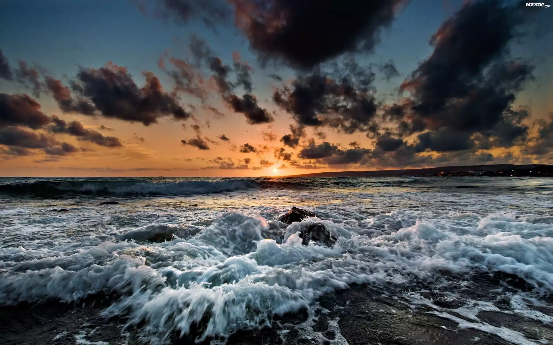 Zdjęcia, Zachód, Słońca, Chmury, Morze, Fale