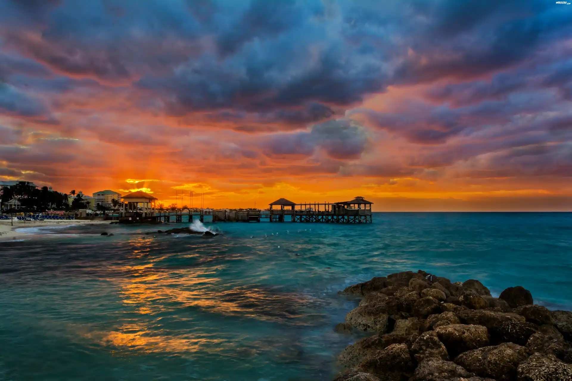 Zdjęcia, Zachód Słońca, Chmury, Morze, Molo