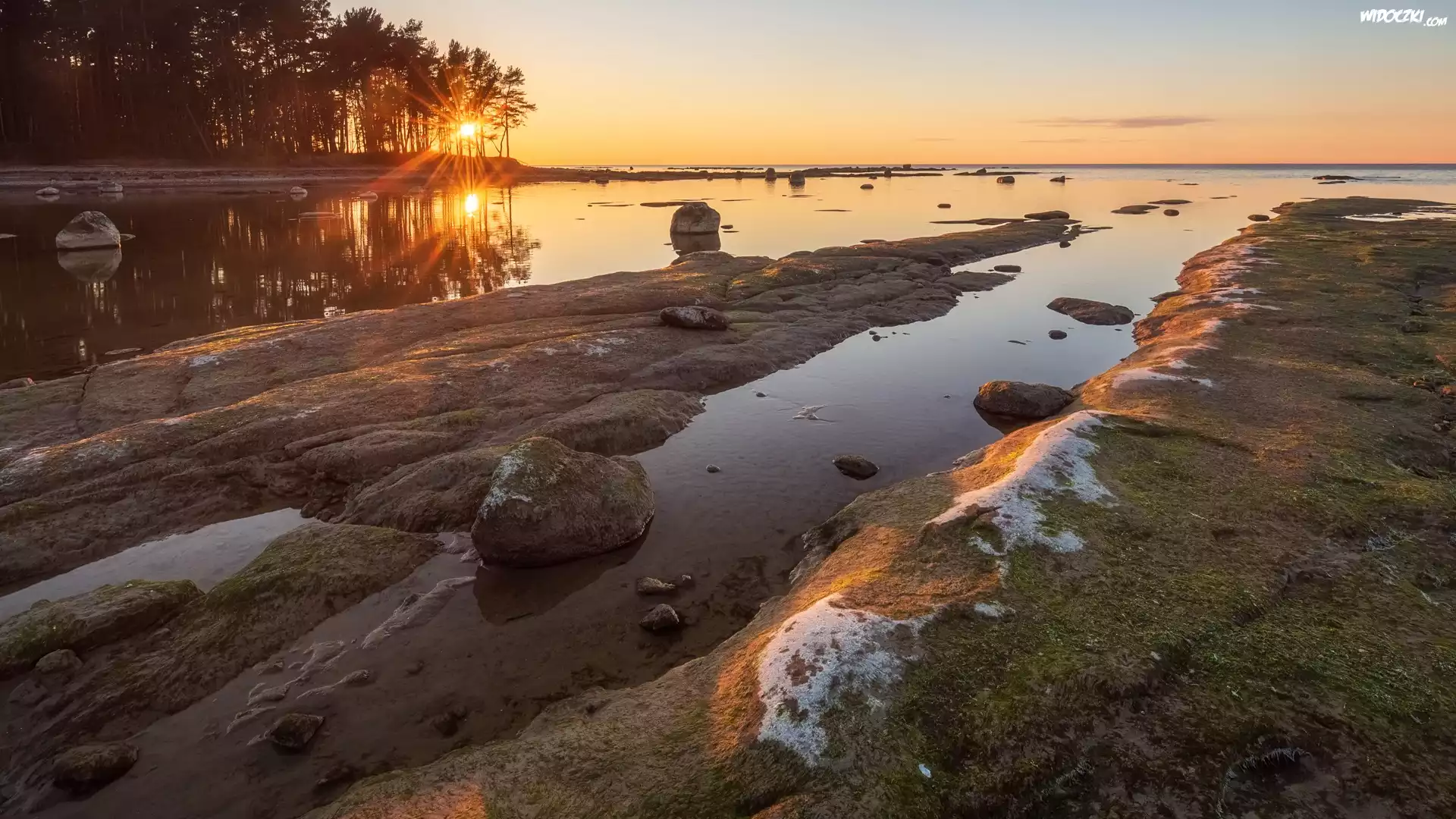 Morze, Zachód słońca, Kamienie, Skały, Wysepki, Drzewa