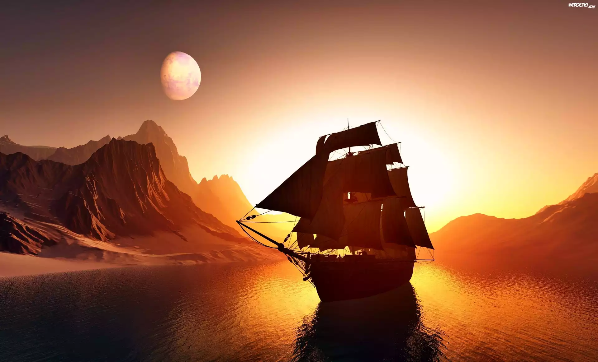 Żaglowiec, Morze, Góry, Zachód Słońca