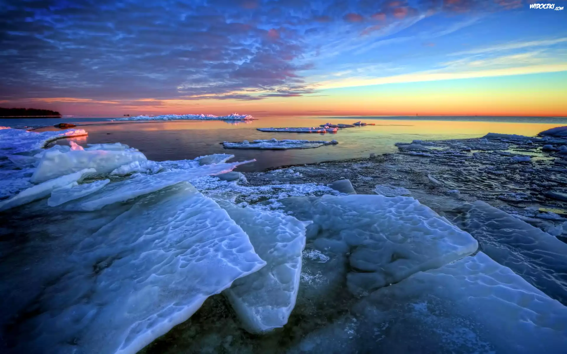Zdjęcia, Zachód Słońca, Kry, Zima, Morze, Niebo