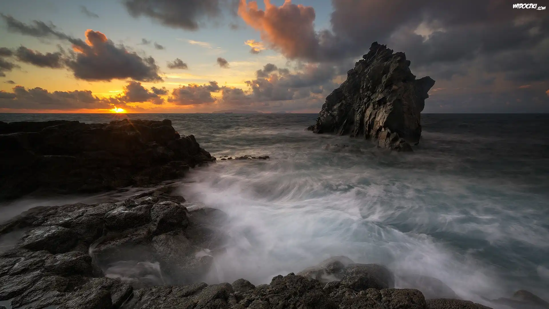 Zdjęcia, Zachód słońca, Ocean, Morze, Skały