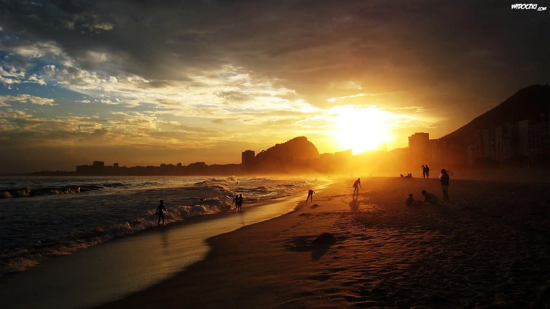 Zdjęcia, Zachód, Słońca, Plaża, Morze, Wczasowicze