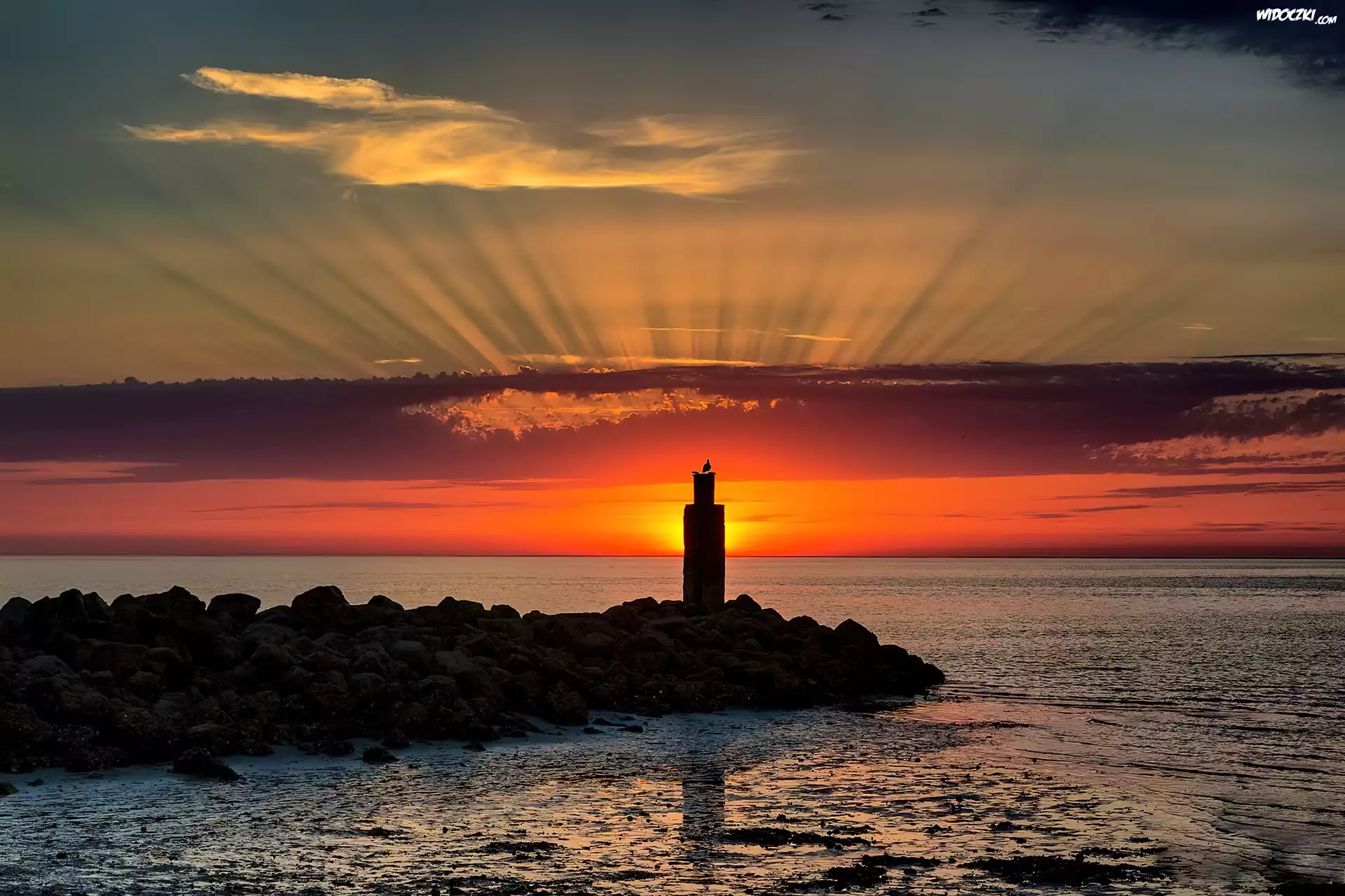 Zdjęcia, Zachód, Słońca, Promienie, Morze, Latarnia