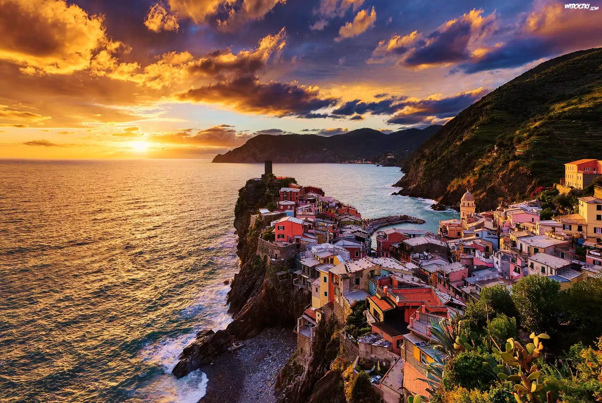 Zdjęcia, Zachód, Słońca, Skały, Morze, Domy