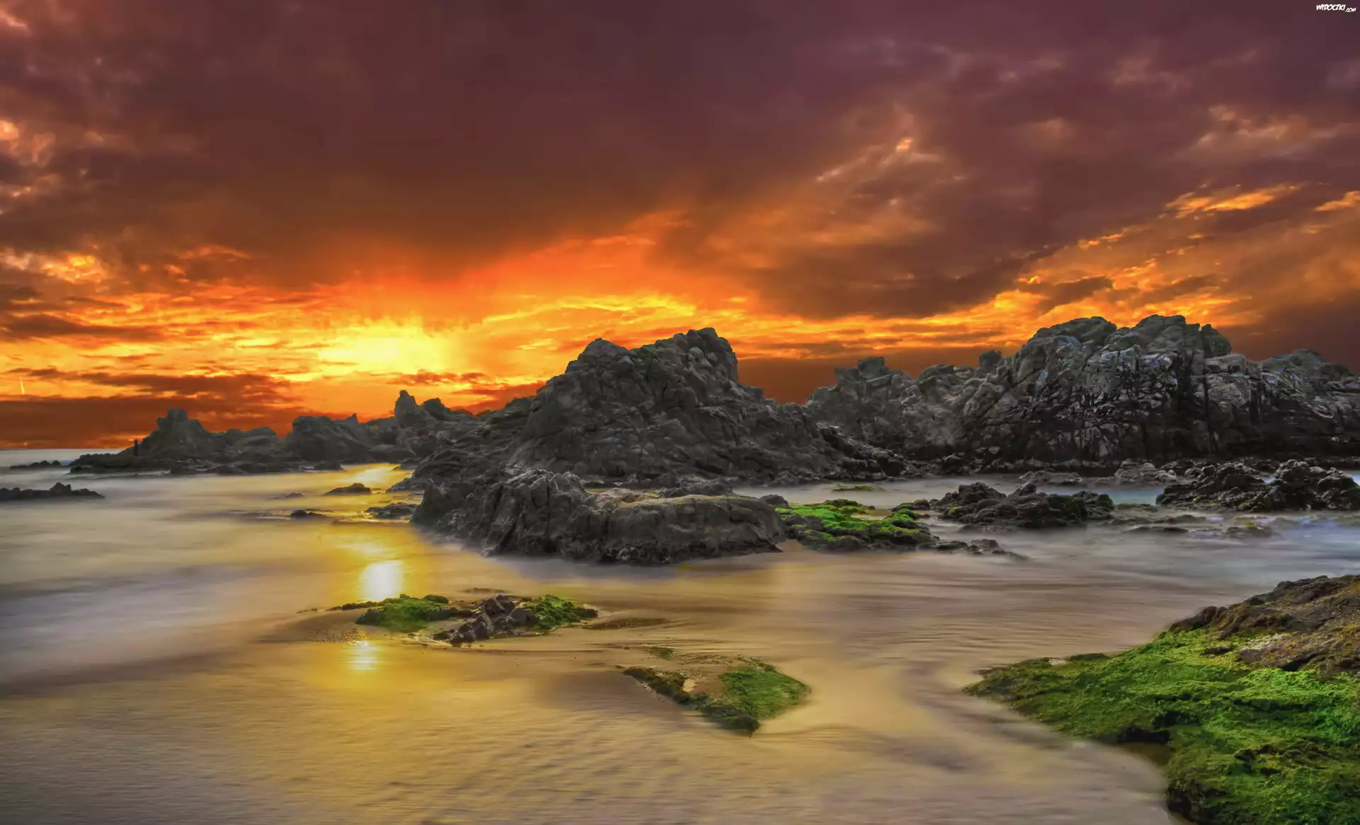 Zachód słońca, Skały, Morze, Wybrzeże