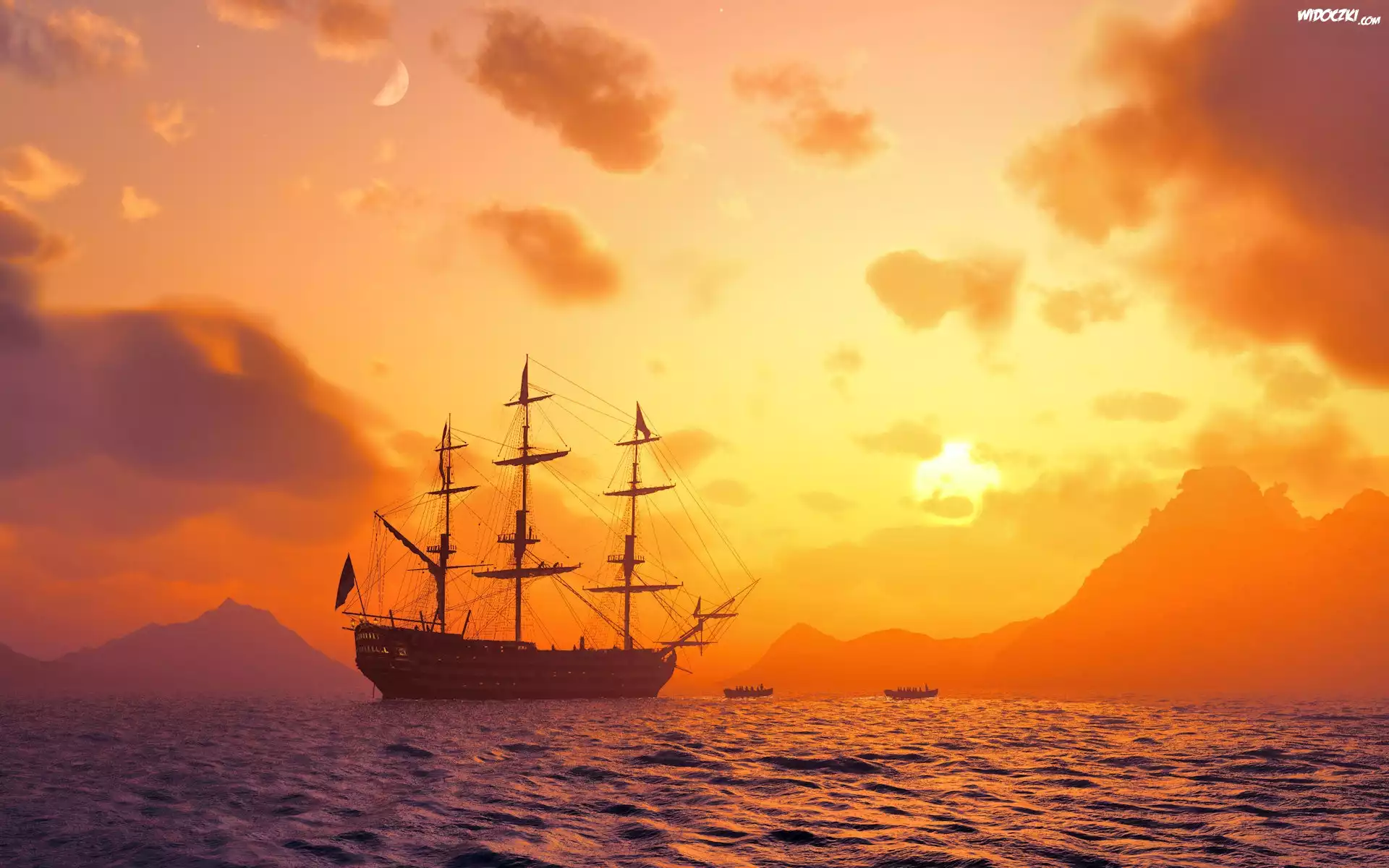 Zdjęcia, Zachód, Słońca, Morze, Żaglowiec