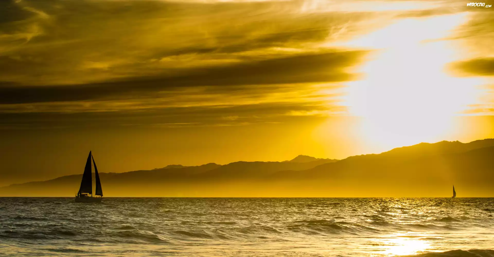 Zachód słońca, Morze, Góry, Żaglówka