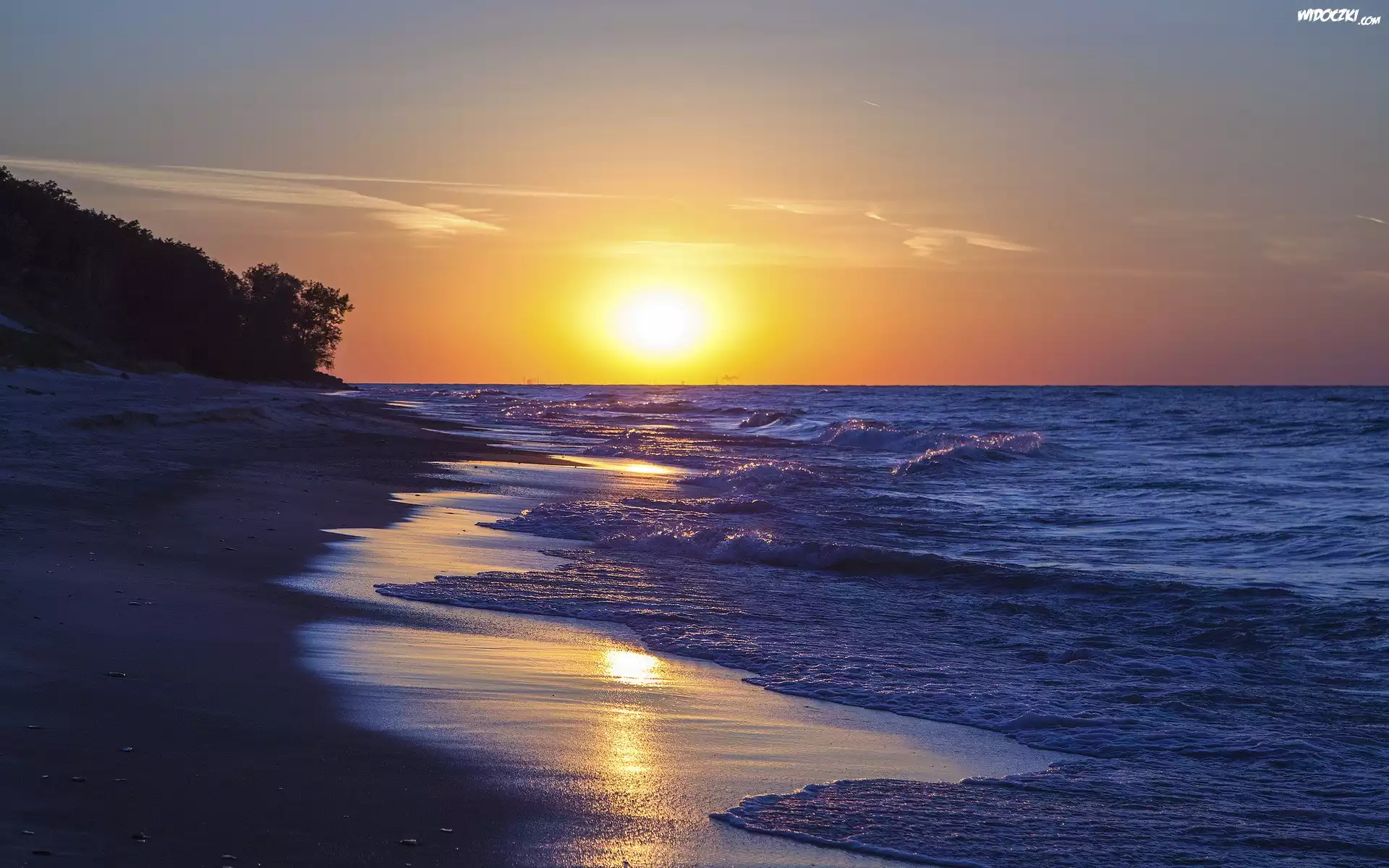 Zdjęcia, Zachód, Słońca, Morze, Drzewa