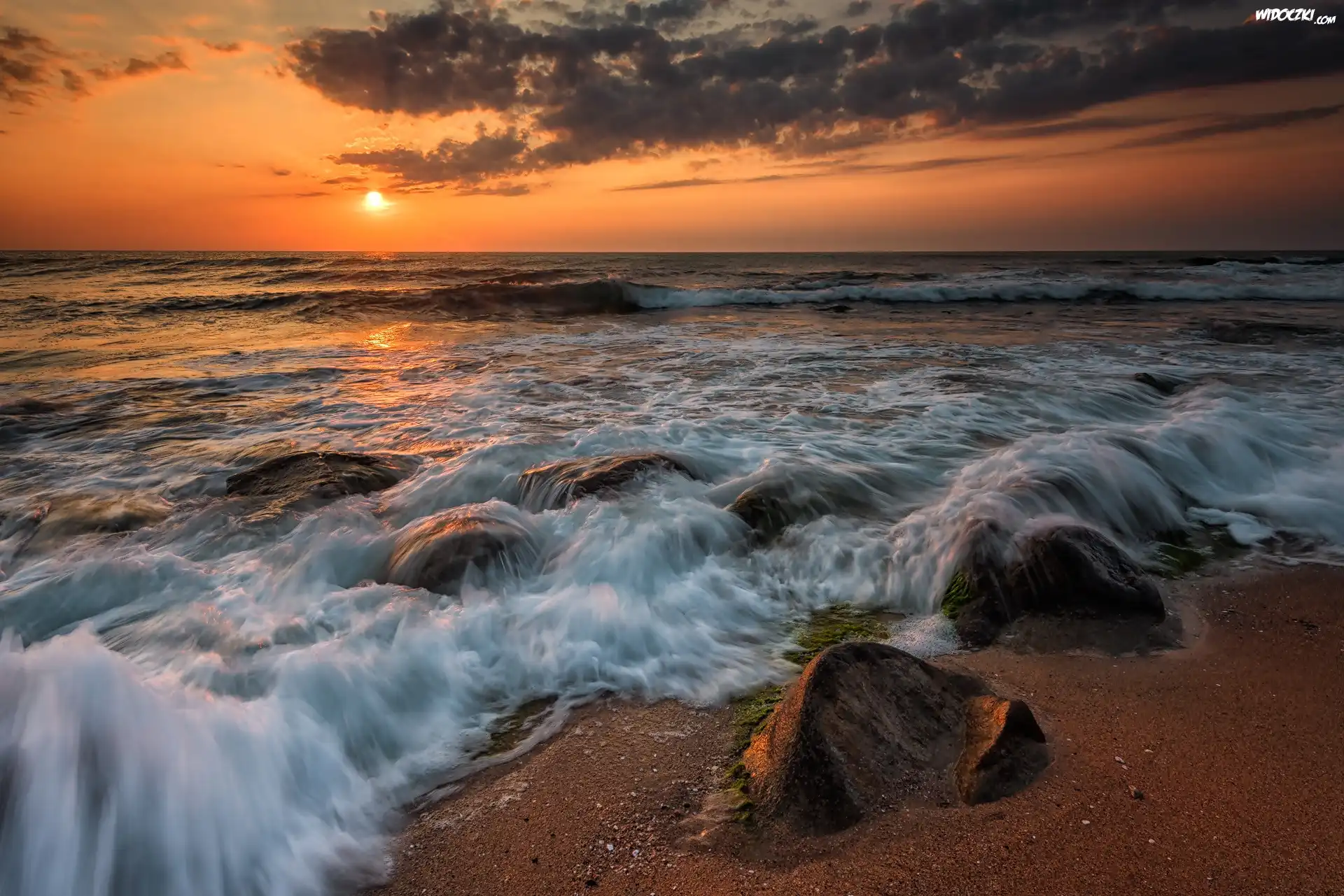 Zdjęcia, Zachód słońca, Morze, Kamienie