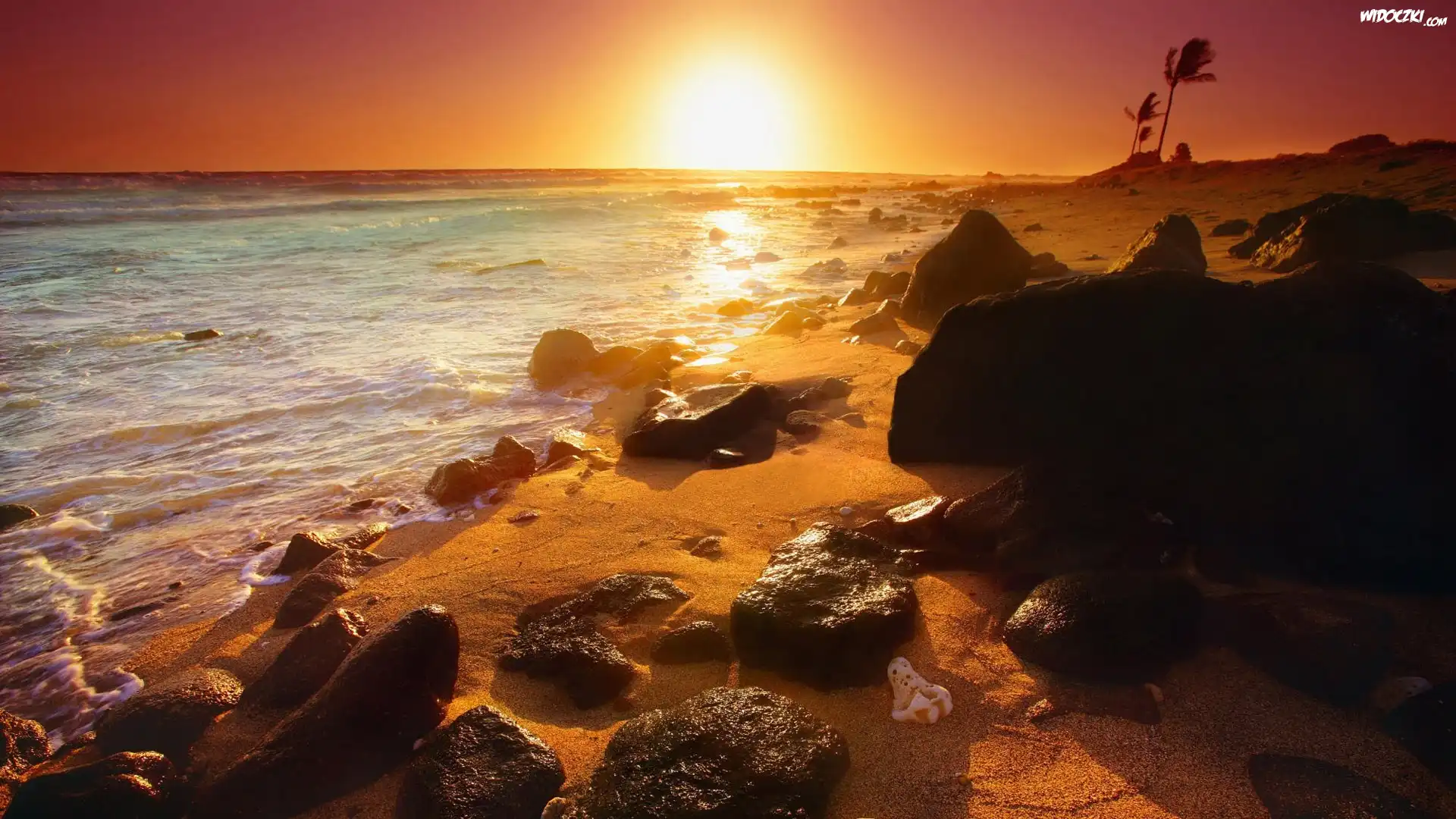 Zdjęcia, Zachód, Słońca, Morze, Kamienie