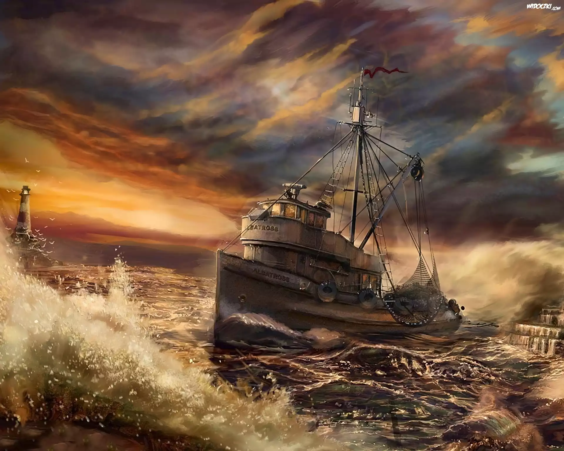 Zdjęcia, Zachód, Słońca, Morze, Kuter