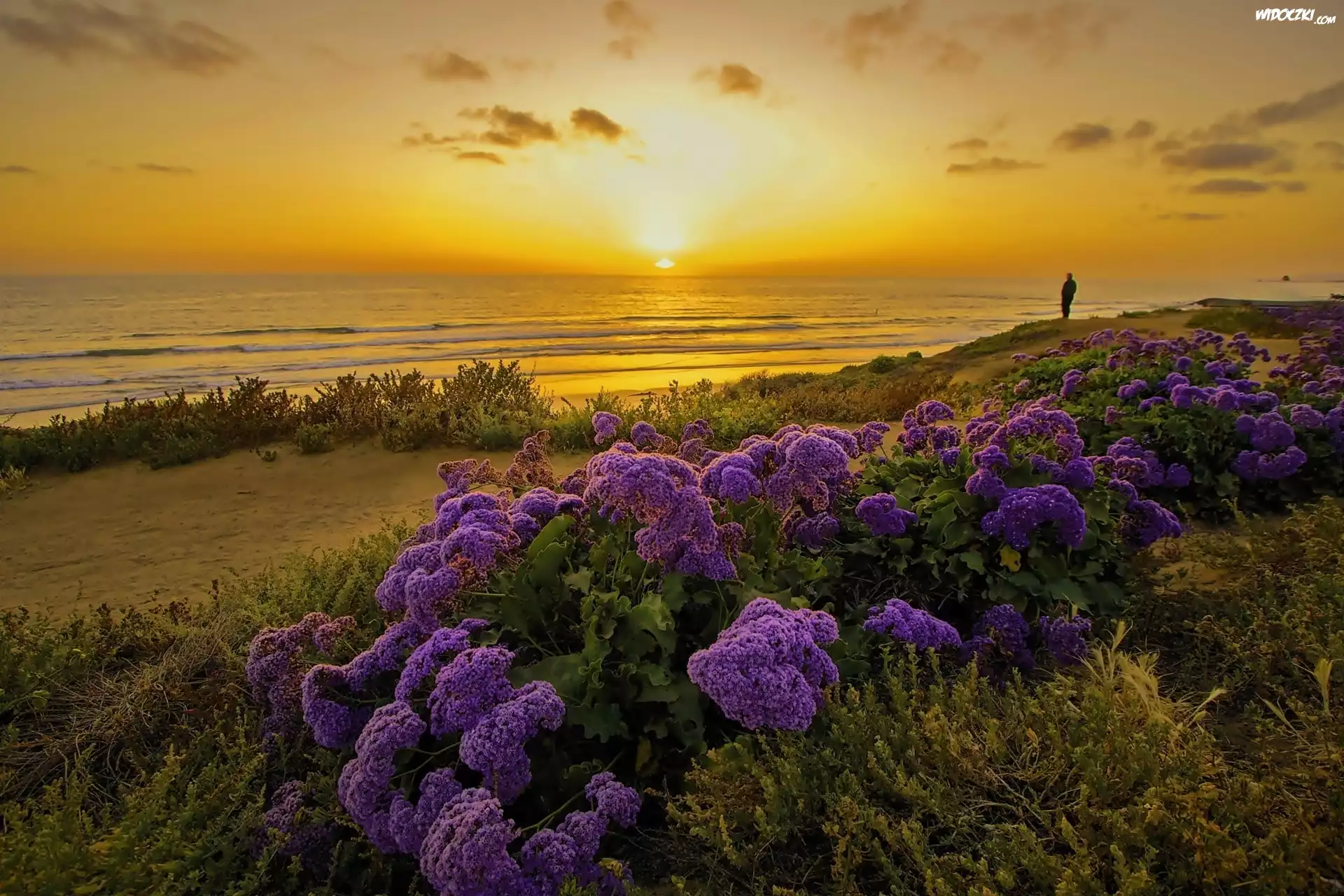 Zdjęcia, Zachód Słońca, Morze, Kwiaty