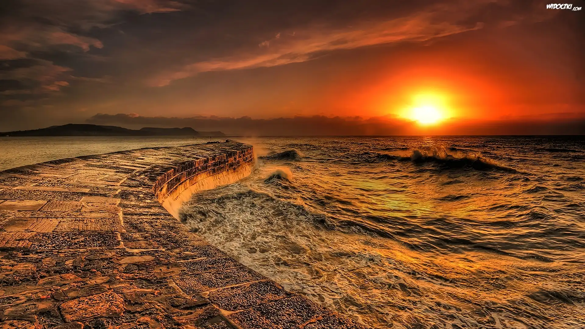 Zdjęcia, Zachód, Słońca, Morze, Murek