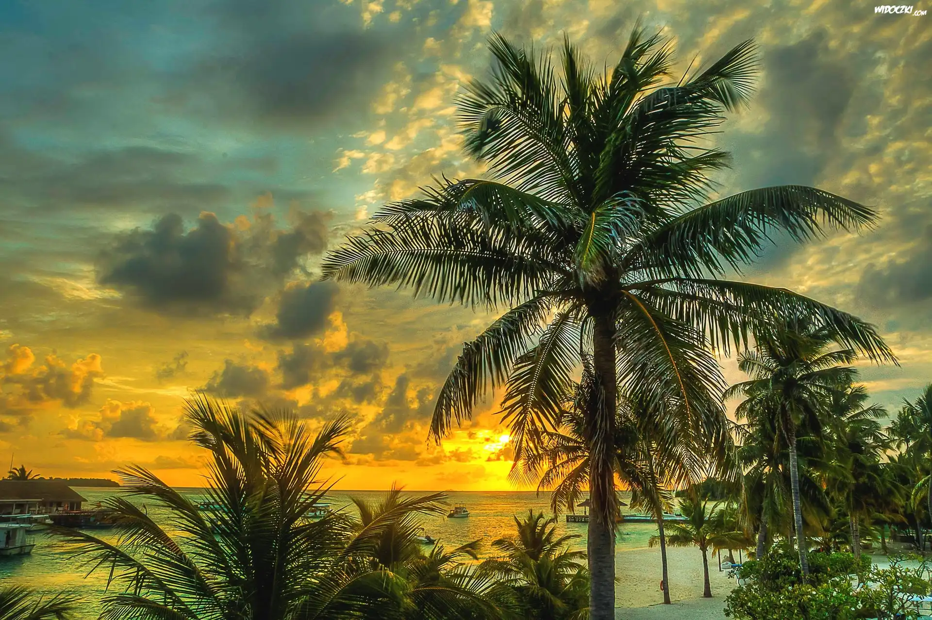 Zdjęcia, Zachód, Słońca, Morze, Palmy