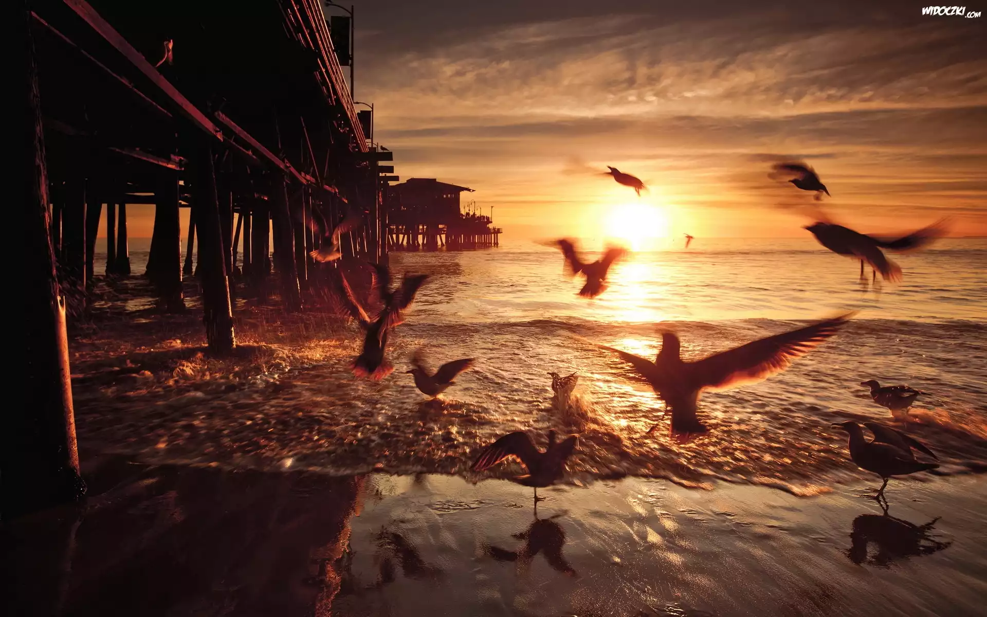 Zdjęcia, Zachód, Słońca, Morze, Ptaki