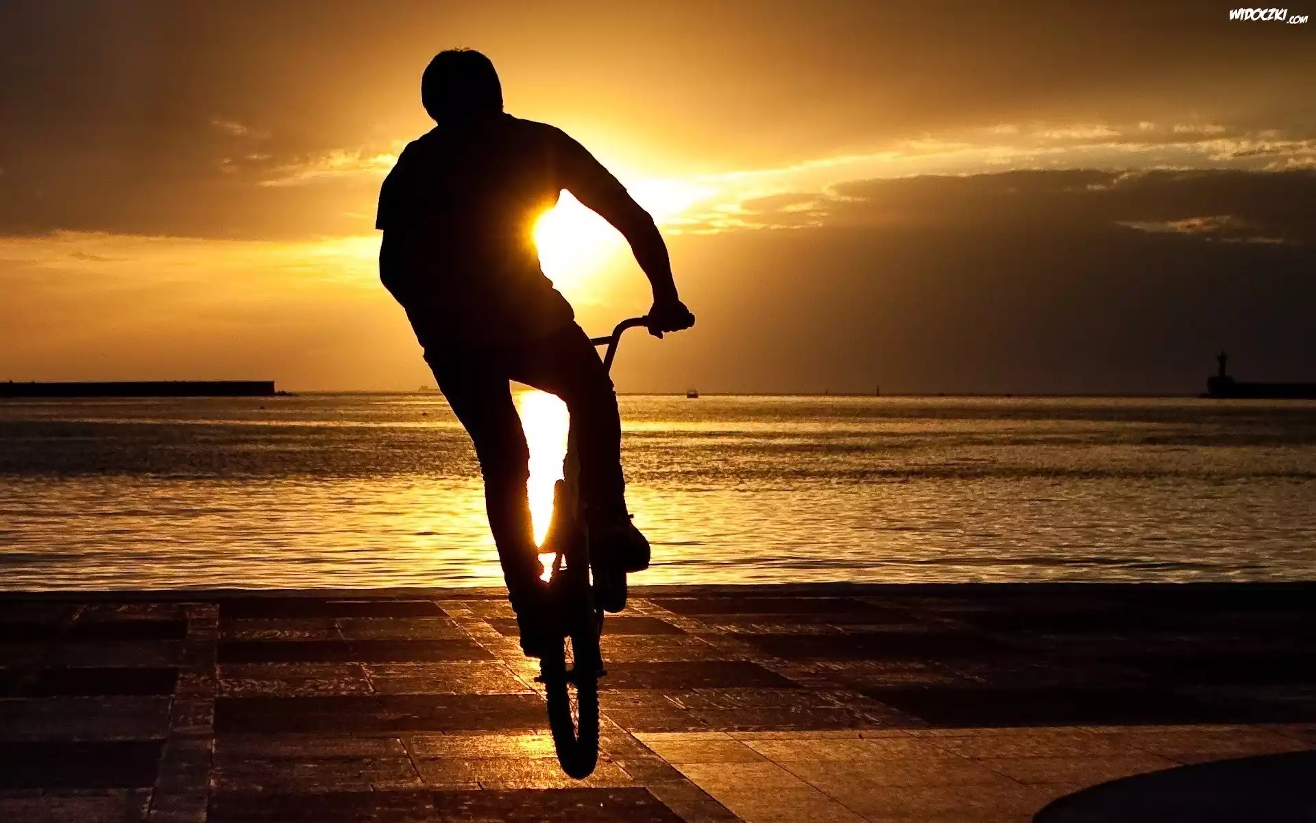 Zdjęcia, Zachód, Słońca, Morze, Rowerzysta