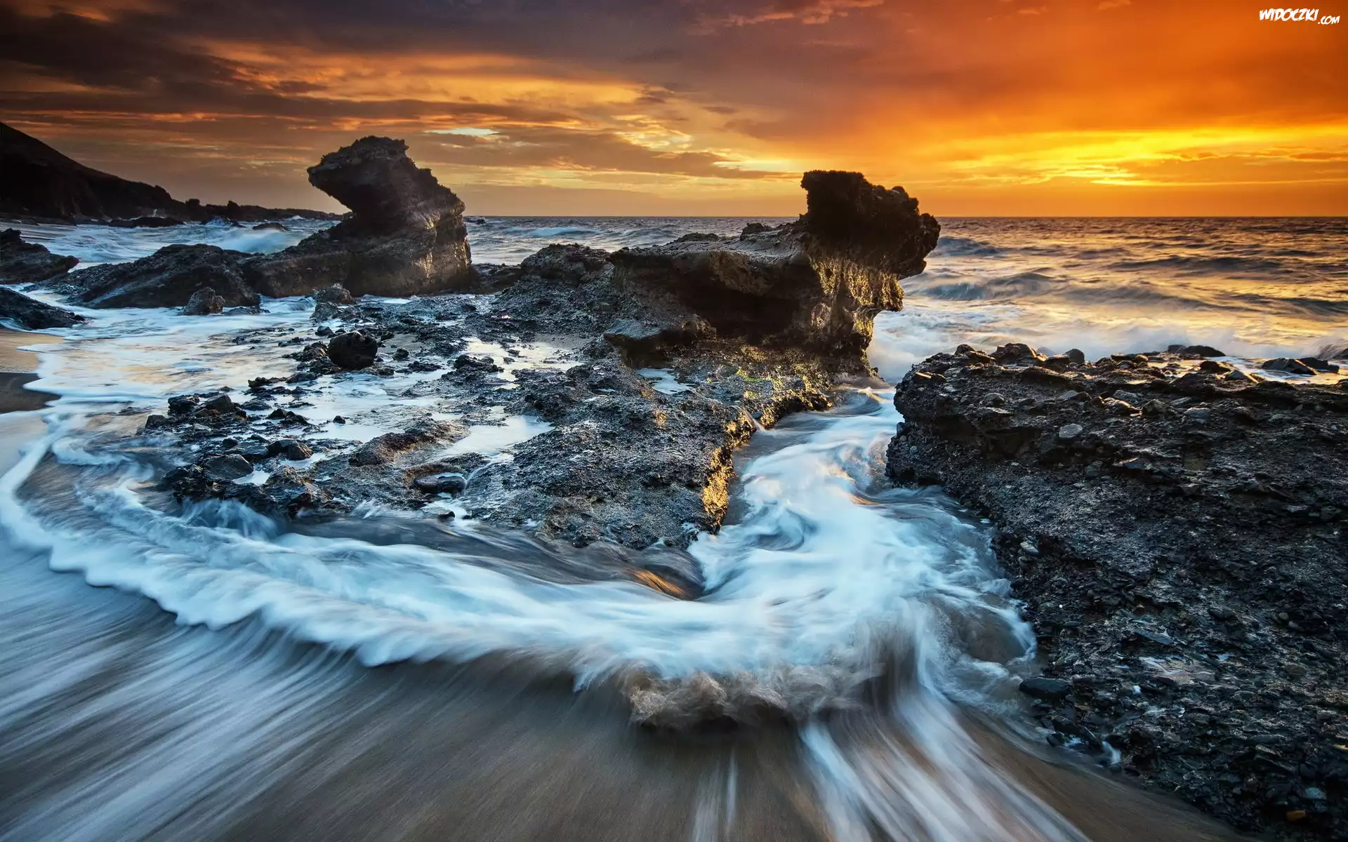 Zdjęcia, Zachód, Słońca, Morze, Skały