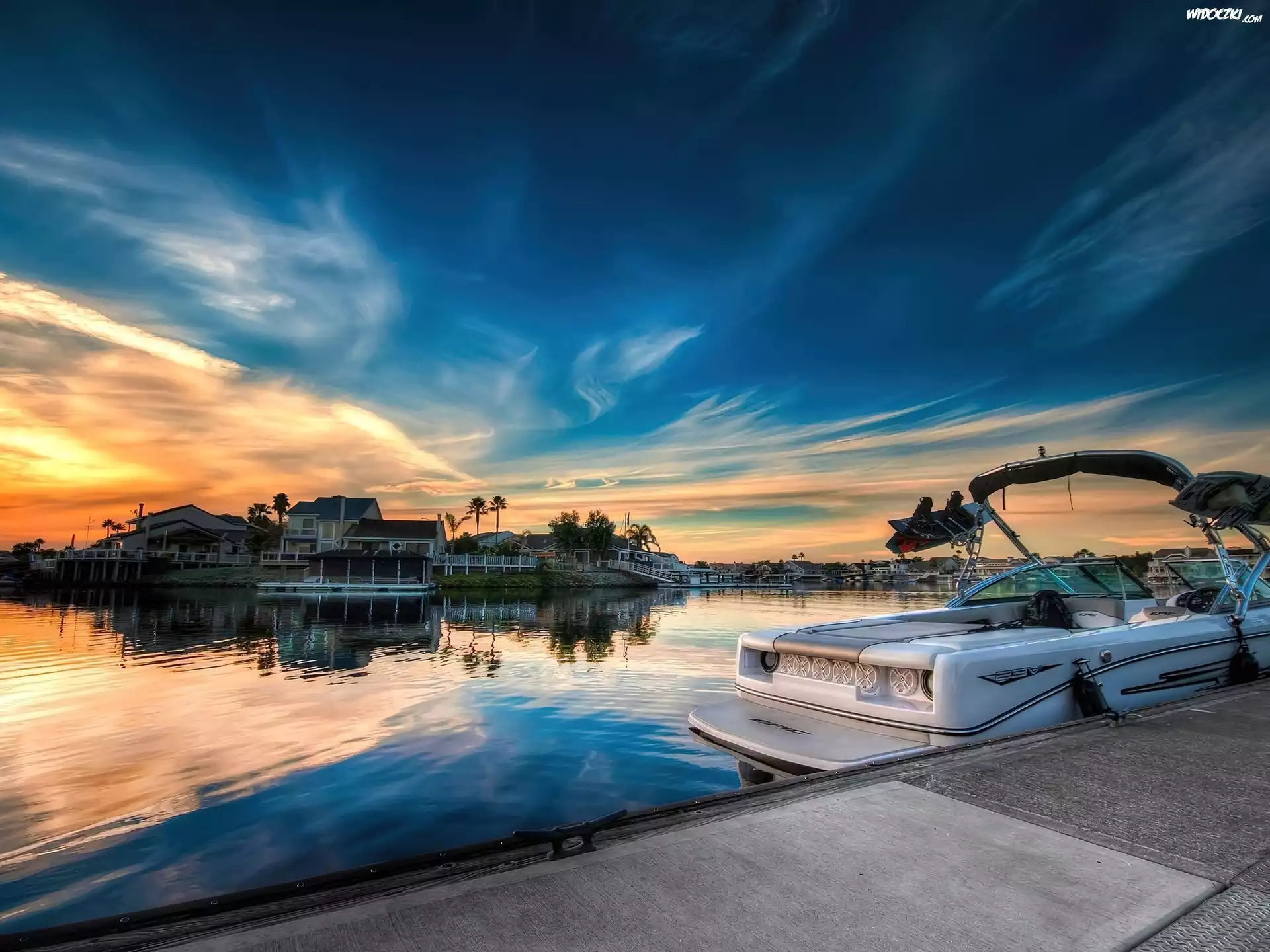 Zachód, Słońca, Niebo, Motorówka, Rzeka