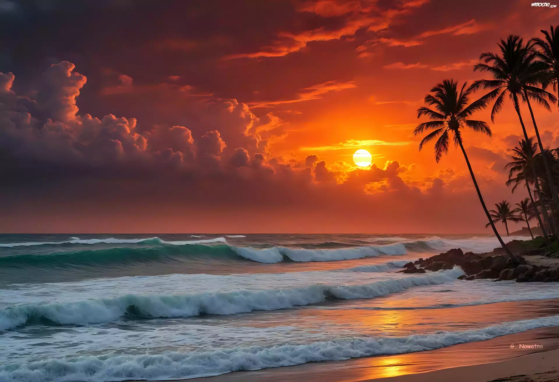 Zdjęcia, Morze, Palmy, Fale, Zachód słońca, Niebo