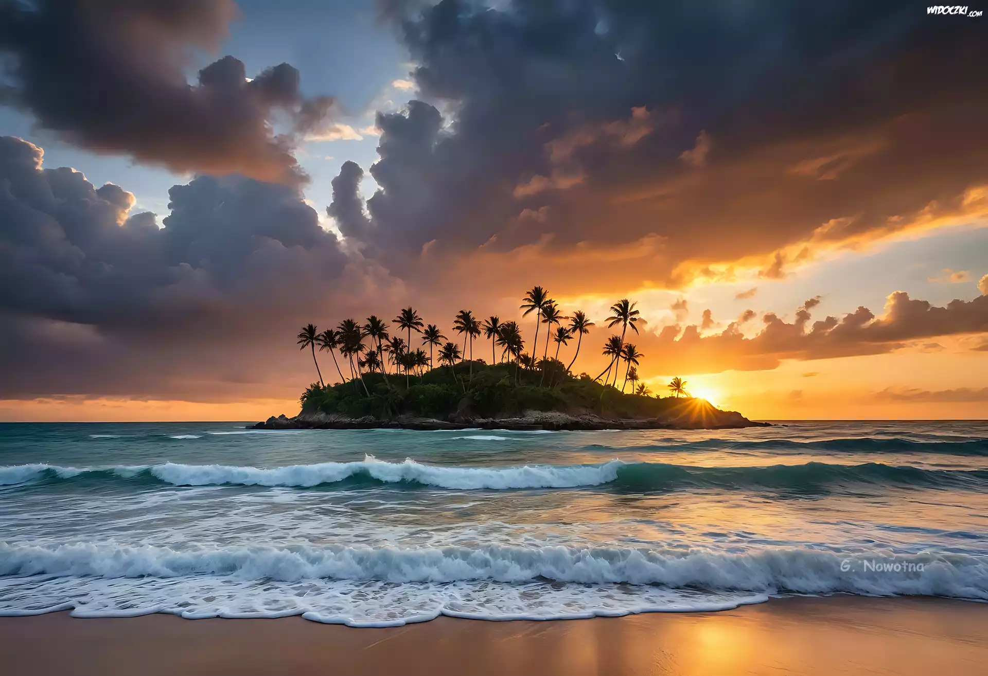 Zdjęcia, Wyspa, Palmy, Morze, Zachód słońca, Niebo