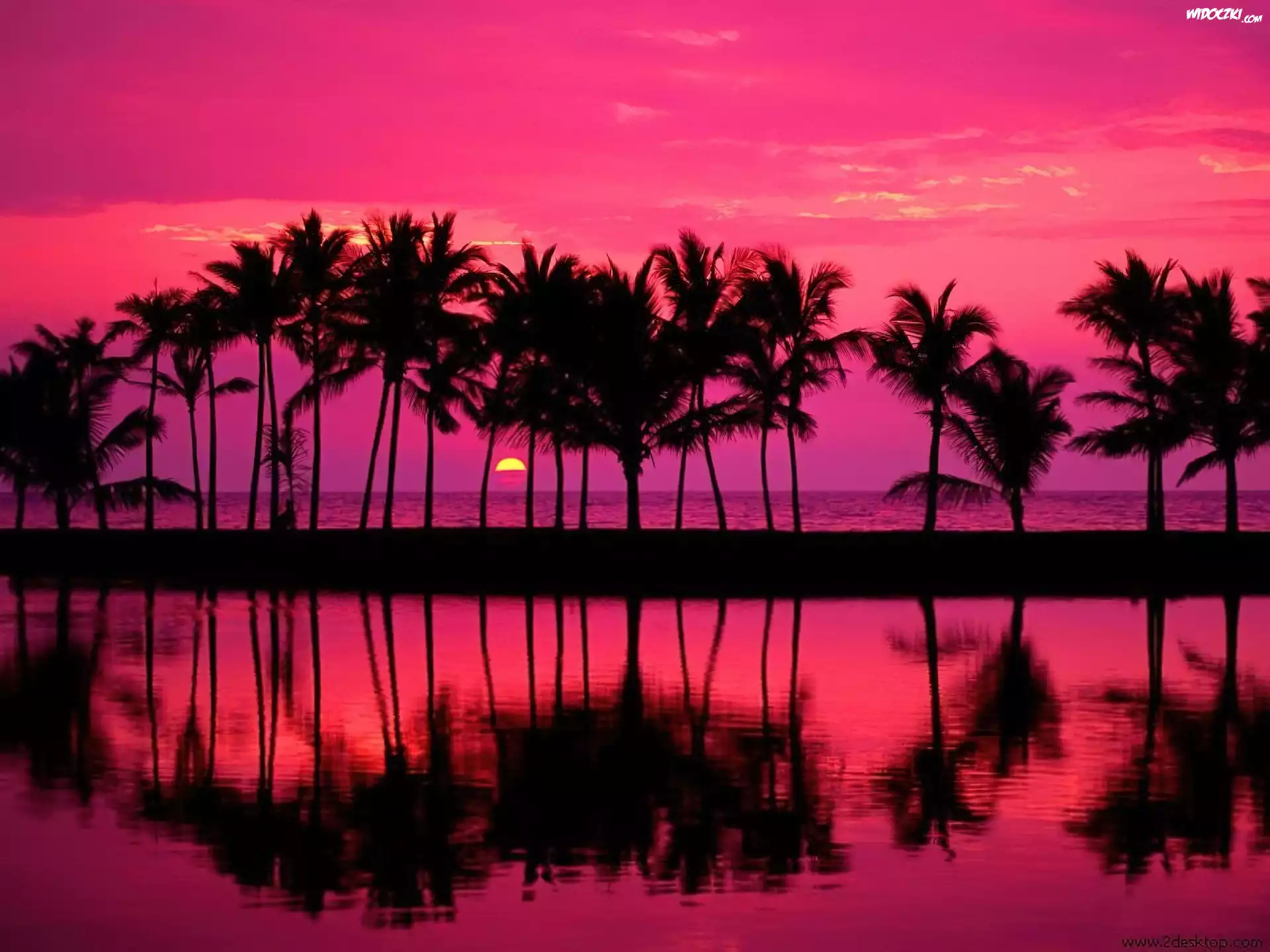 Zachód, Słońca, Różowe, Niebo, Palmy