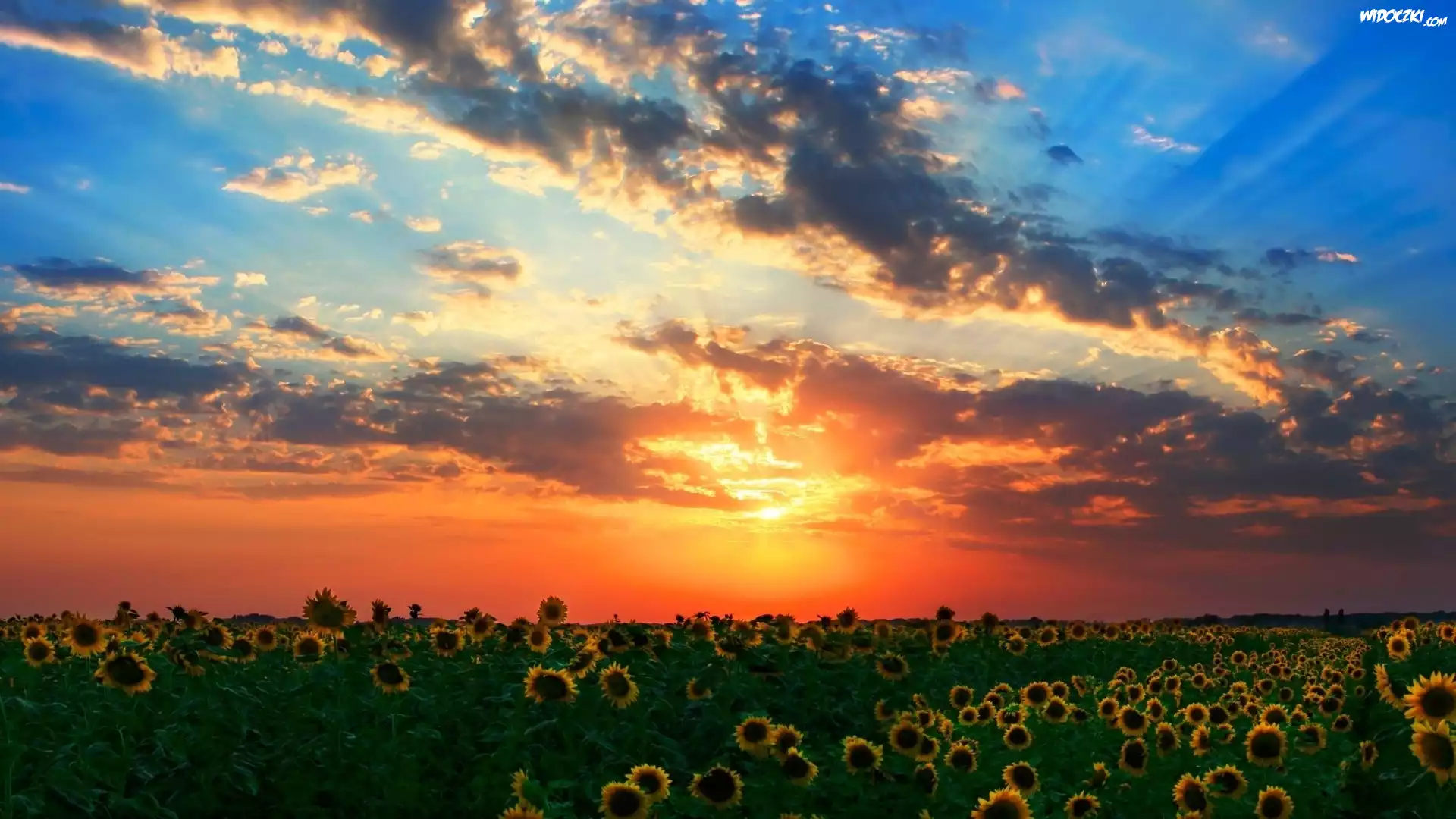 Zdjęcia, Zachód, Słońca, Niebo, Słoneczniki
