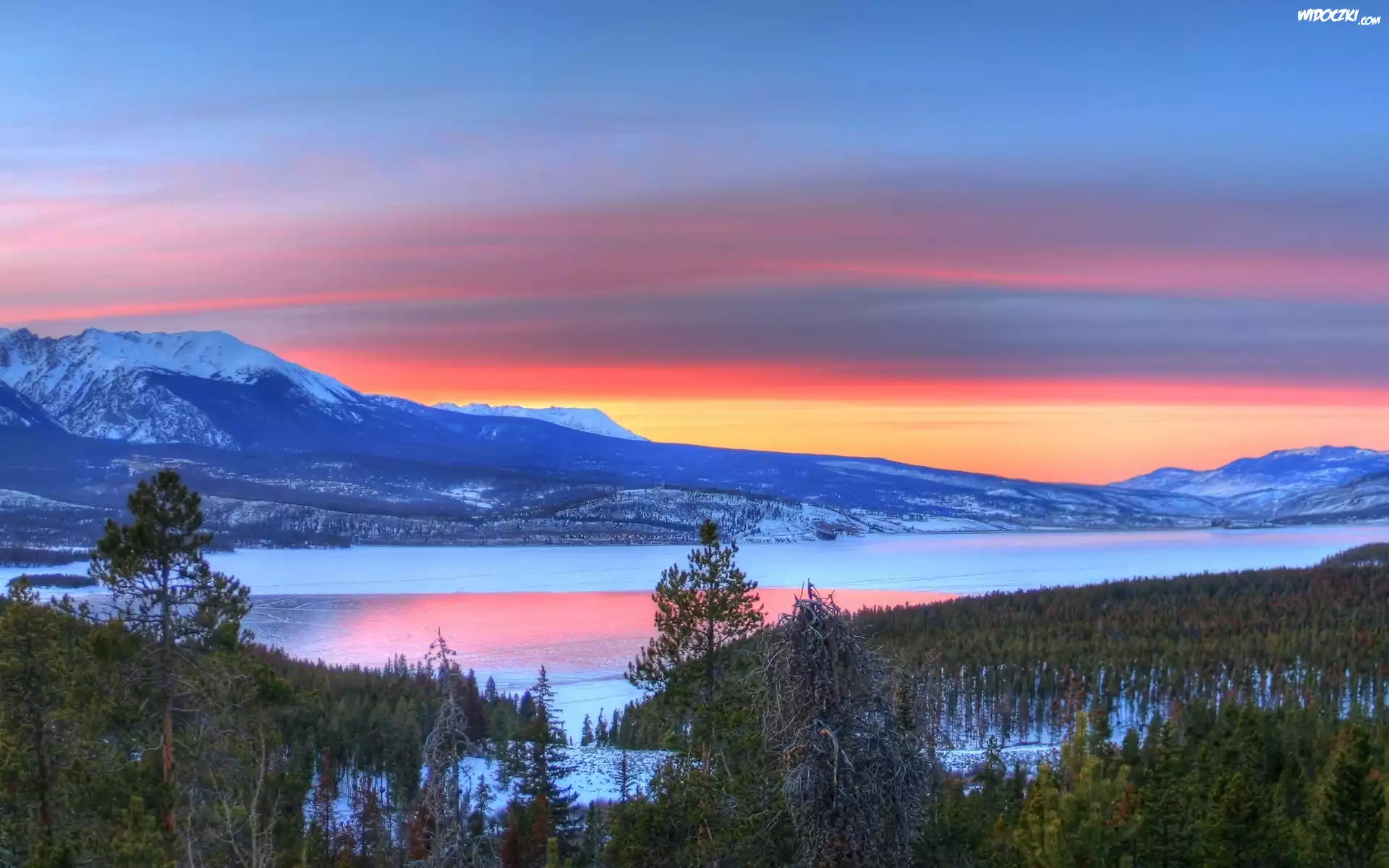 Zachód, Słońca, Jezioro, Góry, Śnieg, Drzewa
