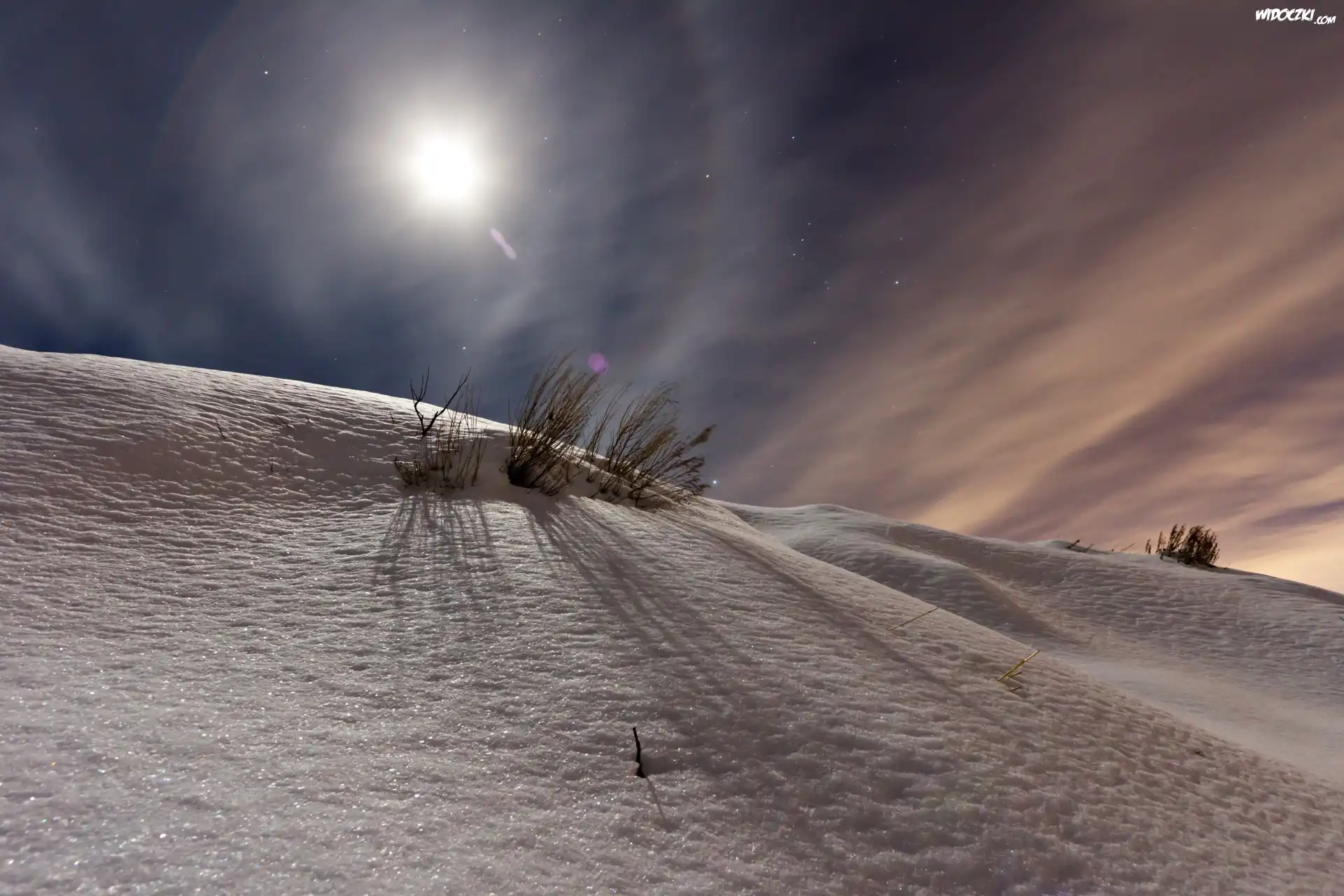 Zdjęcia, Zachód, Słońca, Promienie, Śnieg, Zima