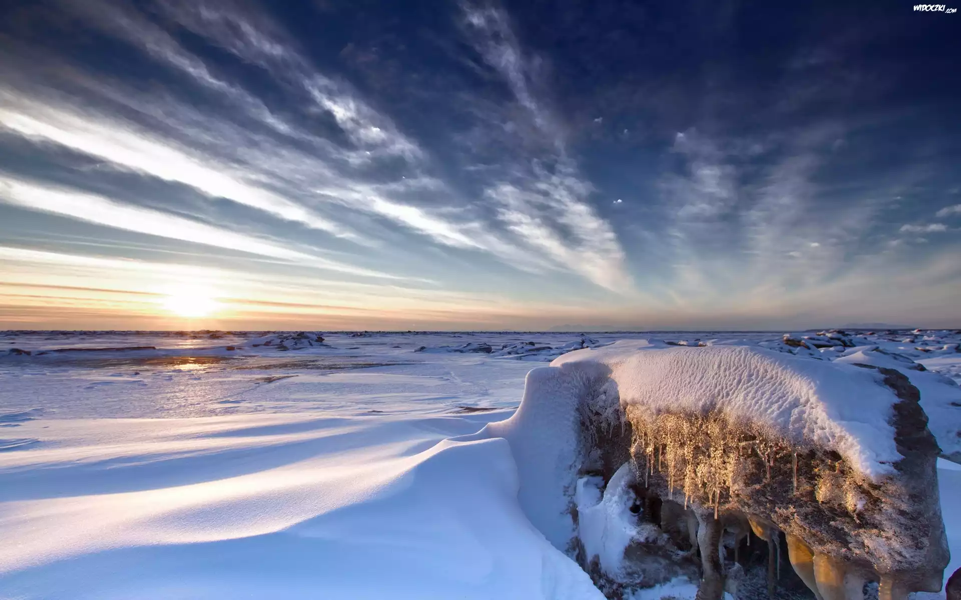 Zachód, Słońca, Skałka, Śnieg, Zima
