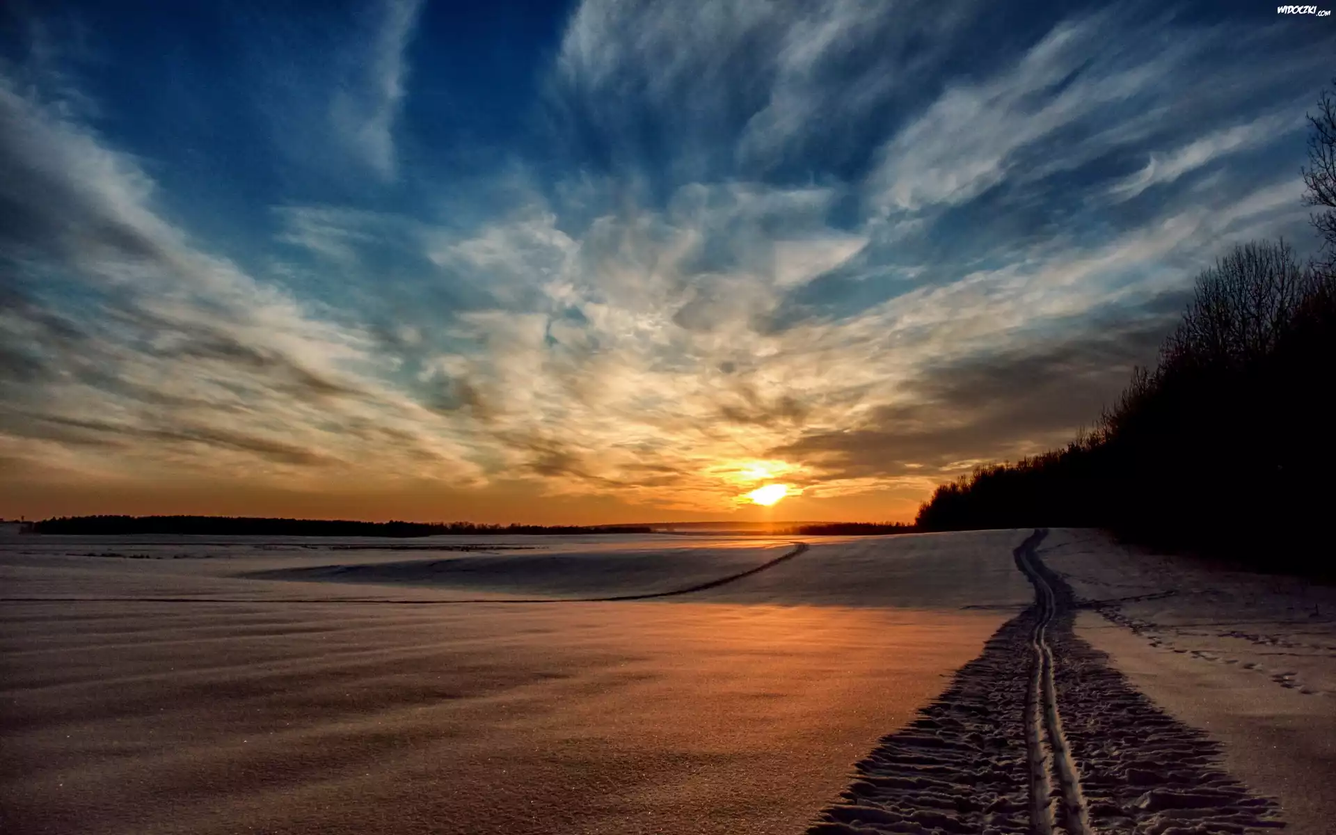 Zdjęcia, Zachód, Słońca, Śnieg, Zima