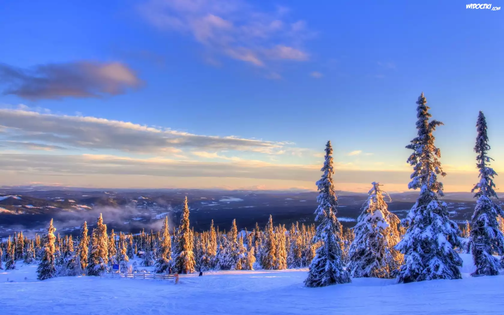 Zdjęcia, Zachód, Słońca, Świerki, Śnieg, Zima