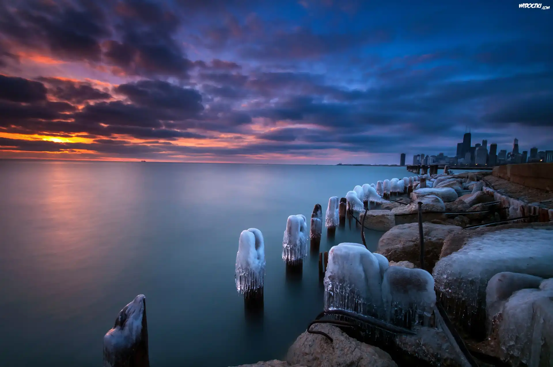 Zdjęcia, Zachód, Słońca, Morze, Oblodzone, Kamienie